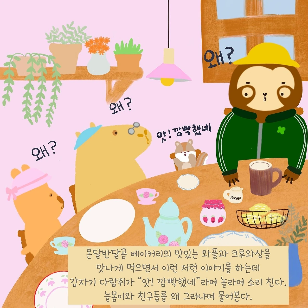 다람쥐와 늘몽이, 밍카 웅카는 온달반달곰 베이커리의 맛난 와플과 크루와상을 먹으며 이런저런 이야기를 나누고 있었다.