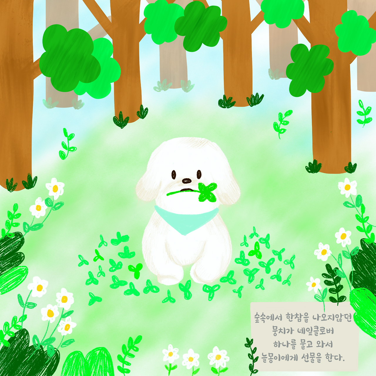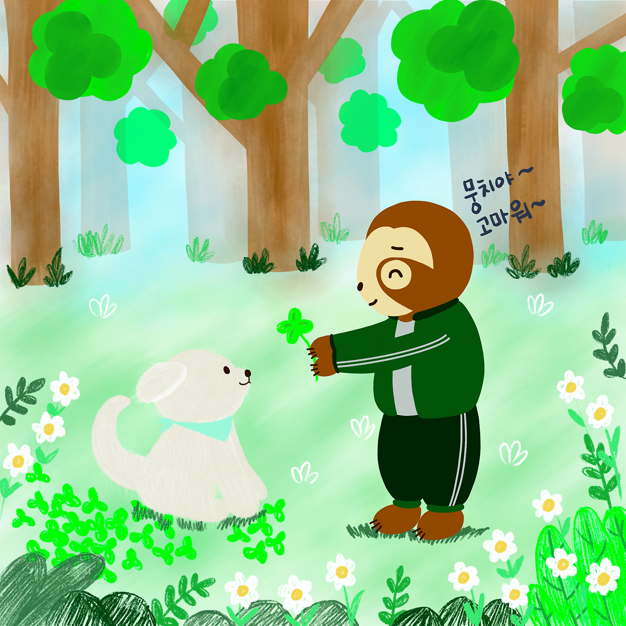 갑자기 풀숲에서 무언가를 한참을 찾던 뭉치가 의기양양한 표정으로 네잎클로버 하나를 입에 물고 나타난다.