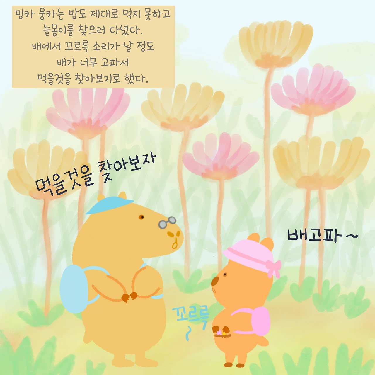 그러다 배에서 꼬르륵 소리가 나고 더이상 늘몽이를 찾기에 힘들어 둘은 지칠때로 지쳐 있었다.