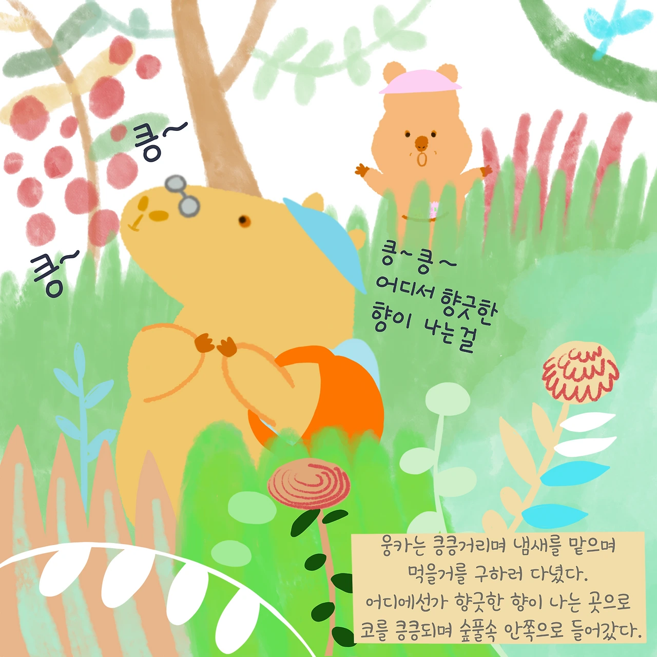 웅카는 숲속에서 코를 킁킁 거리며 먹을 것을 구하러 다녔다.