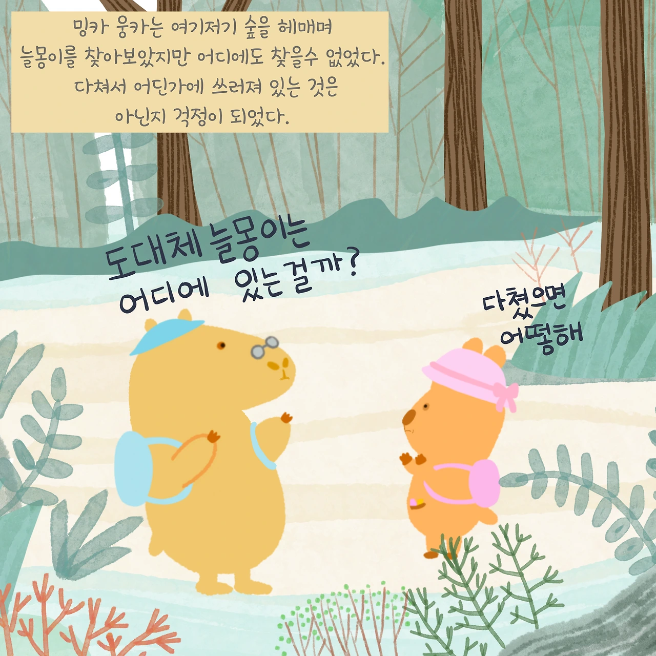 밍카와 웅카는 며칠째 숲 여기저기 늘몽이를 찾아서 헤매였다.