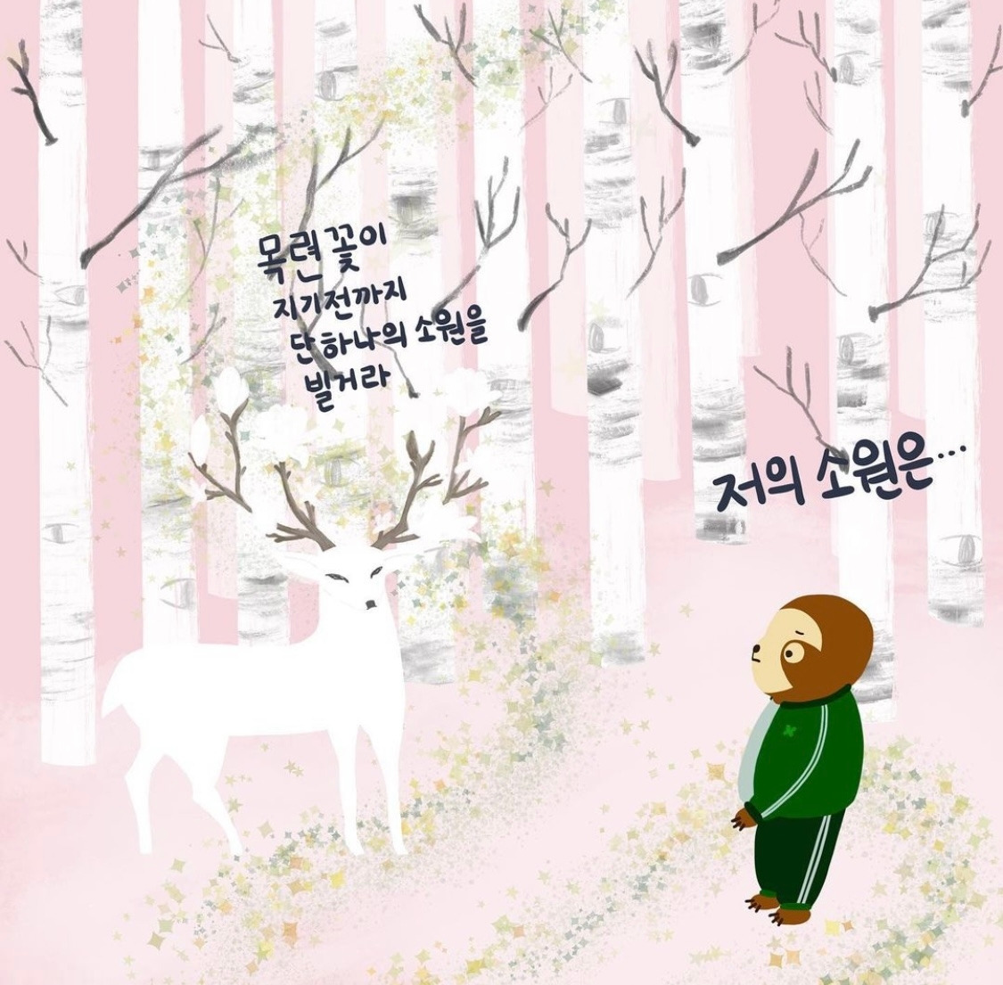 새하얀 털을 가진 숫사슴의 뿔에는 하얀 목련꽃이 피어나기 시작했다.