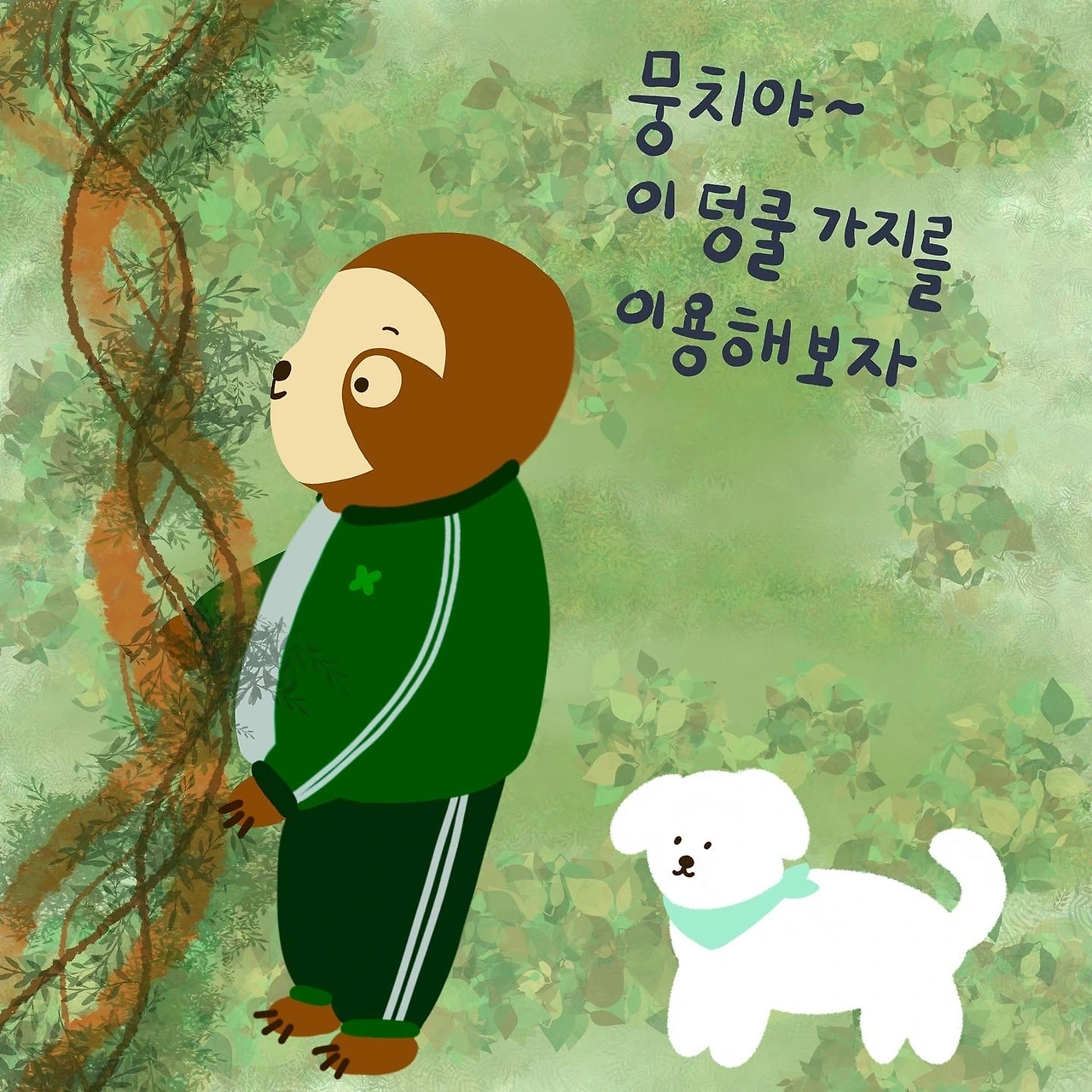 숲이 우거진 곳에 덩쿨가지를 발견하고 제일 얇은 덩쿨로 뭉치의 몸에 묶고 줄을 길게 연결하였다.