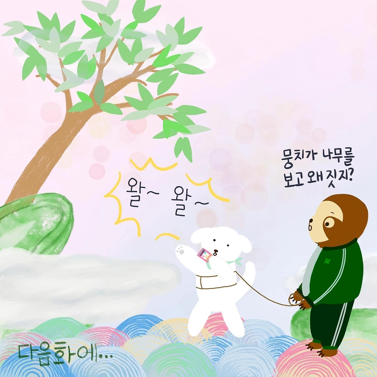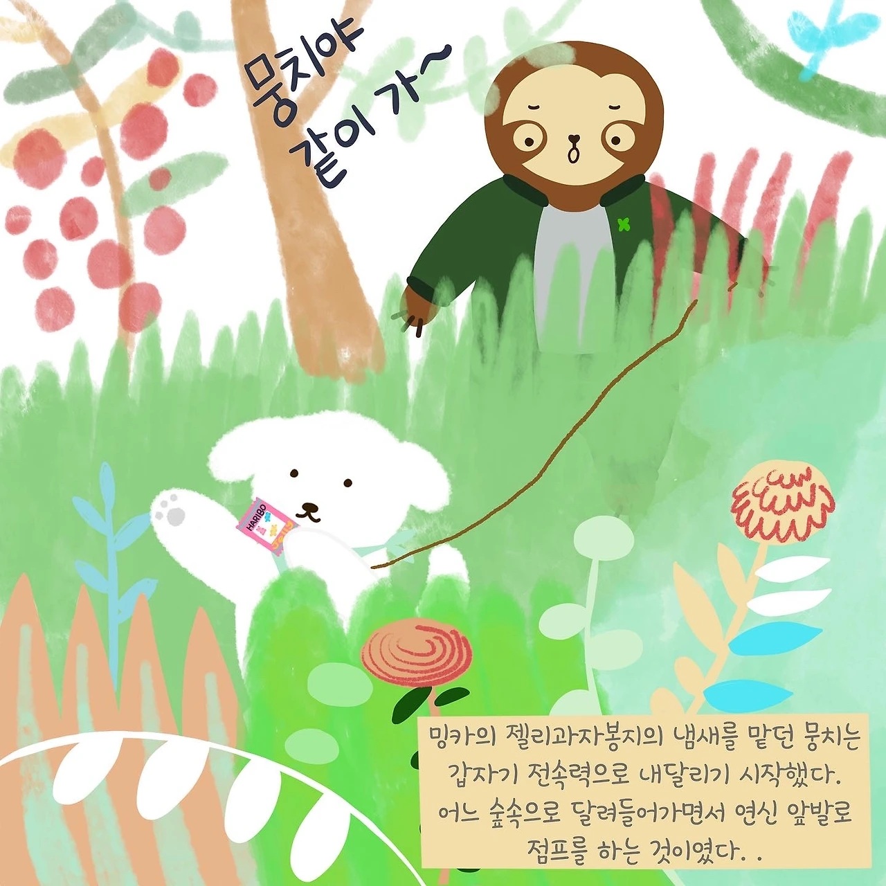 어느 숲속으로 들어간 뭉치는 연신 앞발을 들고 점프를 하기 시작했다.