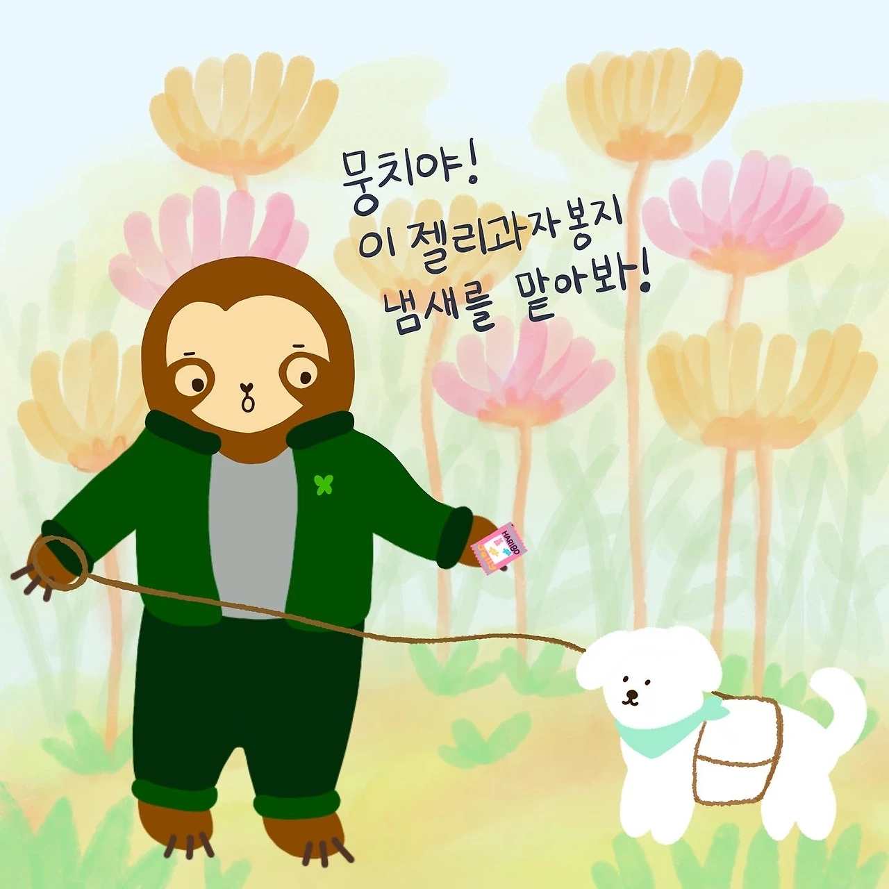 늘몽이는 바닥에 떨어져있는 밍카의 젤리과자봉지을 주워서 뭉치의 코에 갖다대며 냄새를 맡아보라고 말했다.