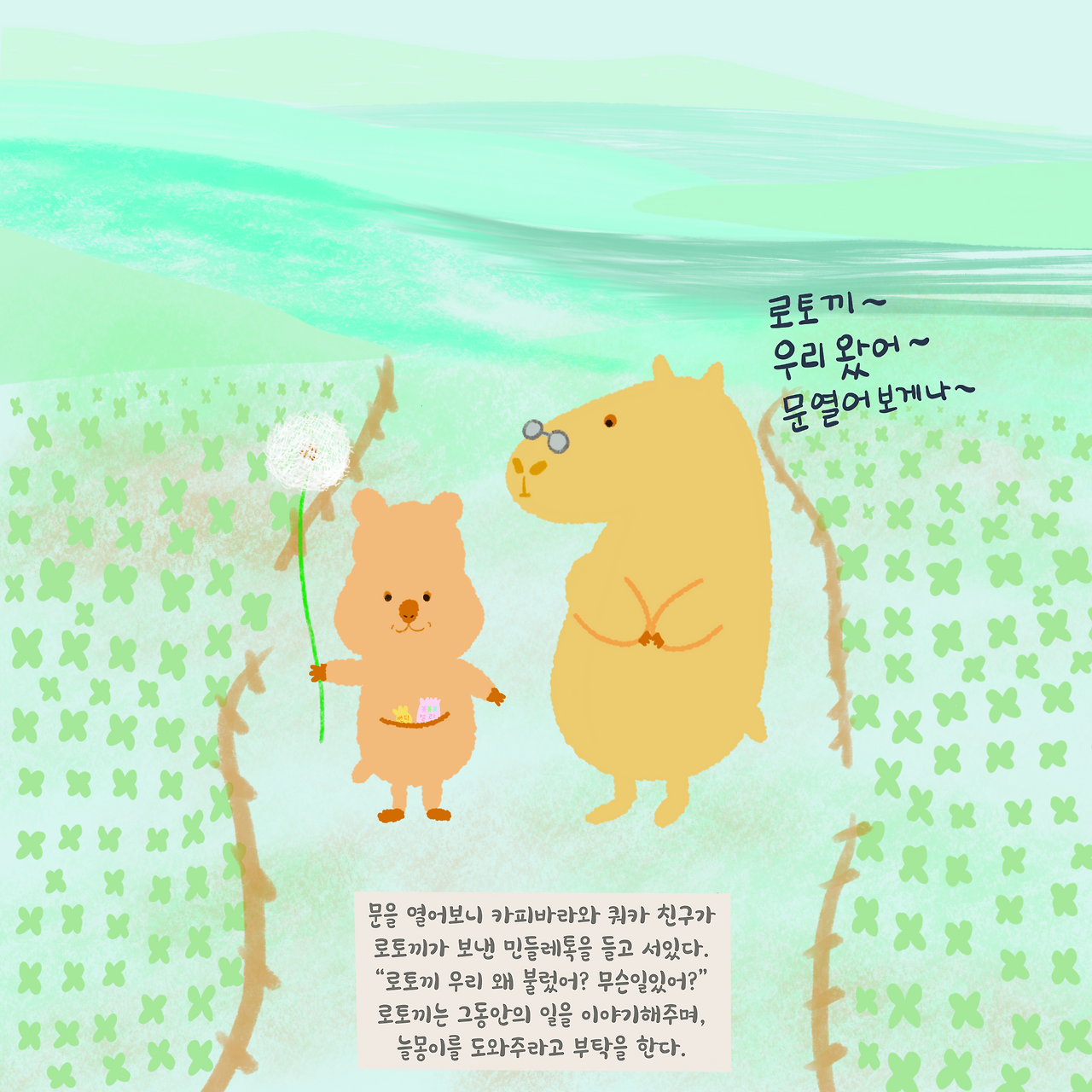 로토끼가 얼른 문을 열어보니 민들레톡을 들고 있는 쿼카와 카피바라 친구들이었다.