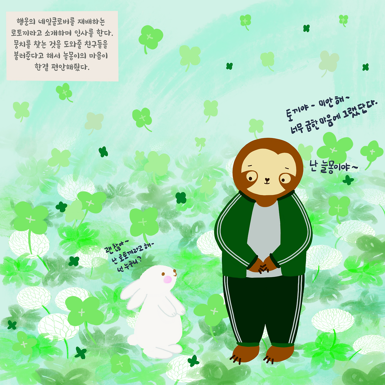 "내이름은 로토끼야. 행운의 네잎클로버를 재배한단다."