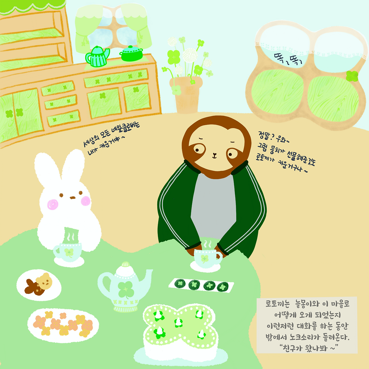 친구들이 오기 전까지 로토끼의 집에서 따뜻한 차와 간식을 먹으며 이런저런 이야기를 나눈다.