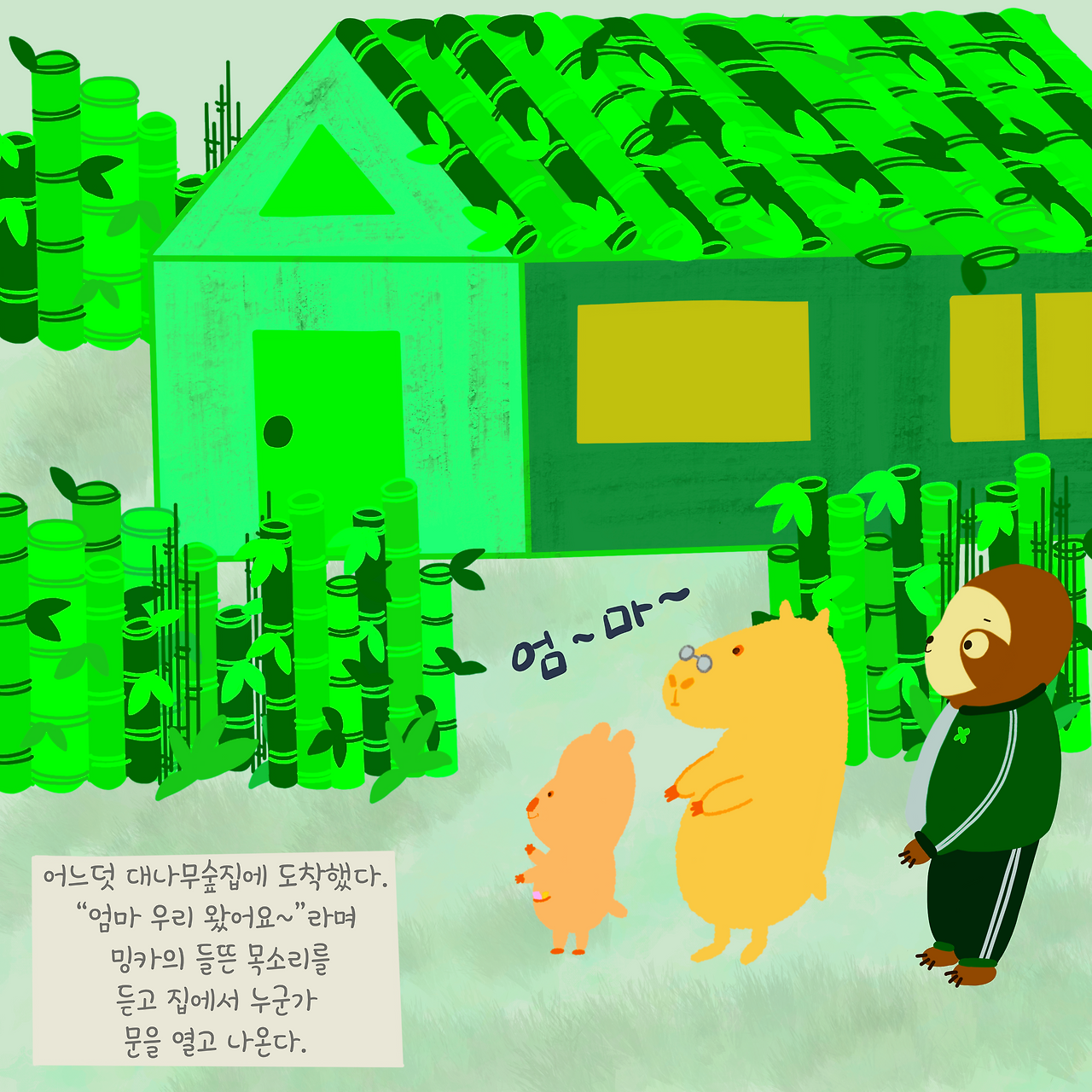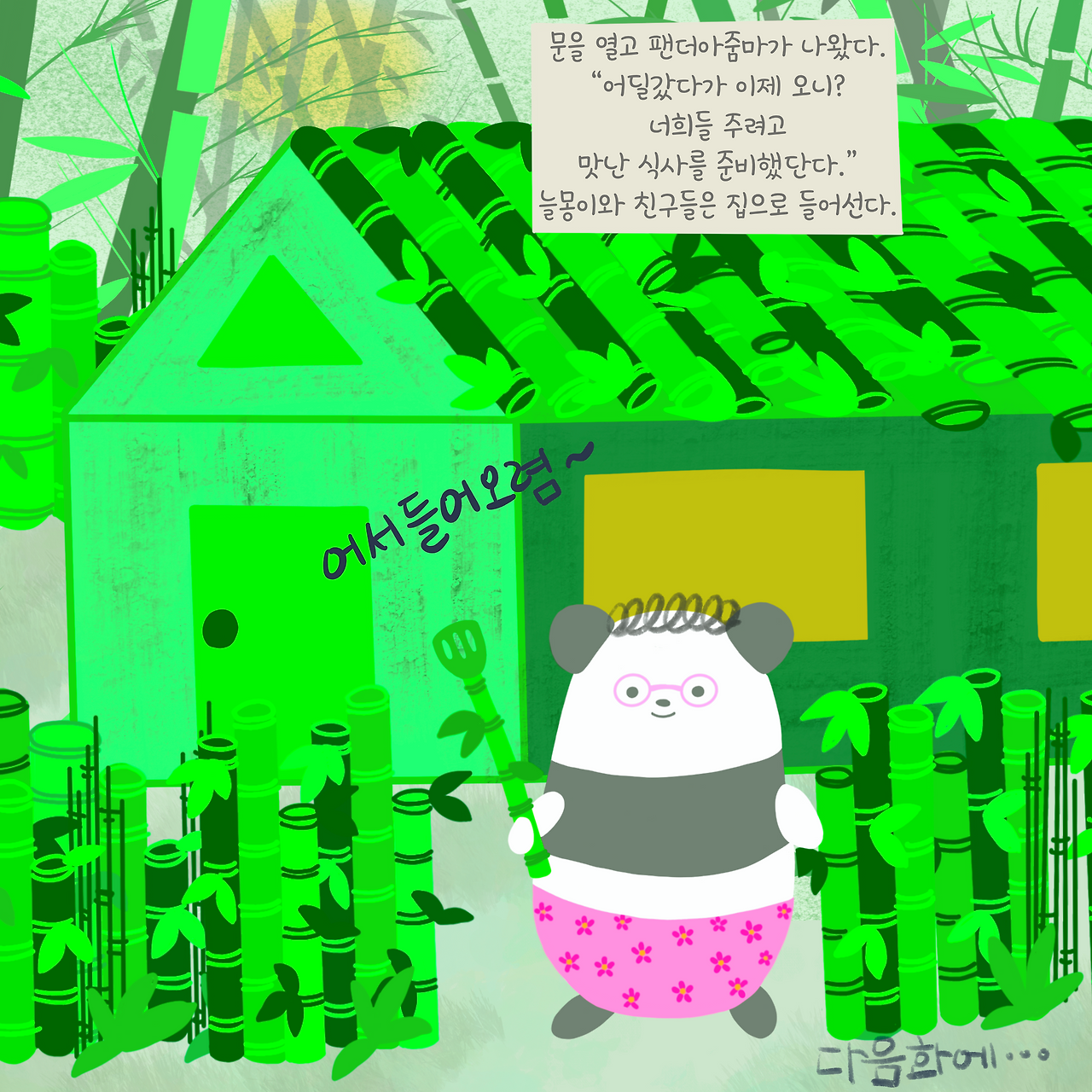 대나무숲집에 문이 열리며 팬더아줌마 한분이 나와서 다정한 목소리로 맞이한다.