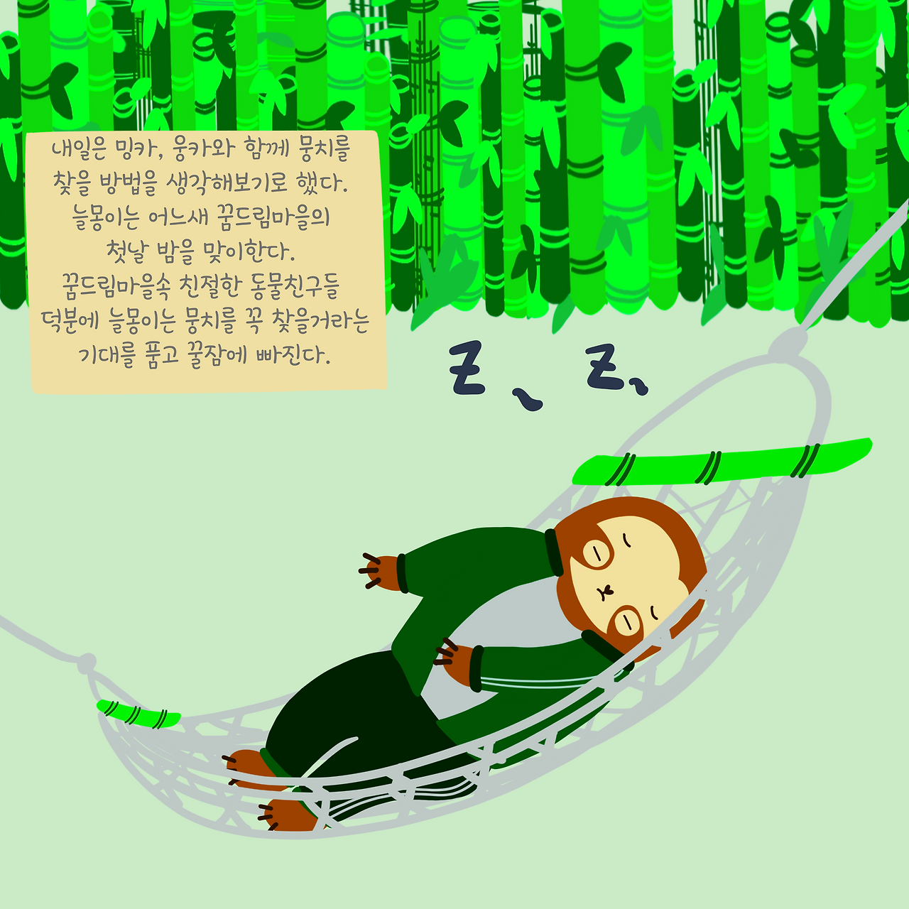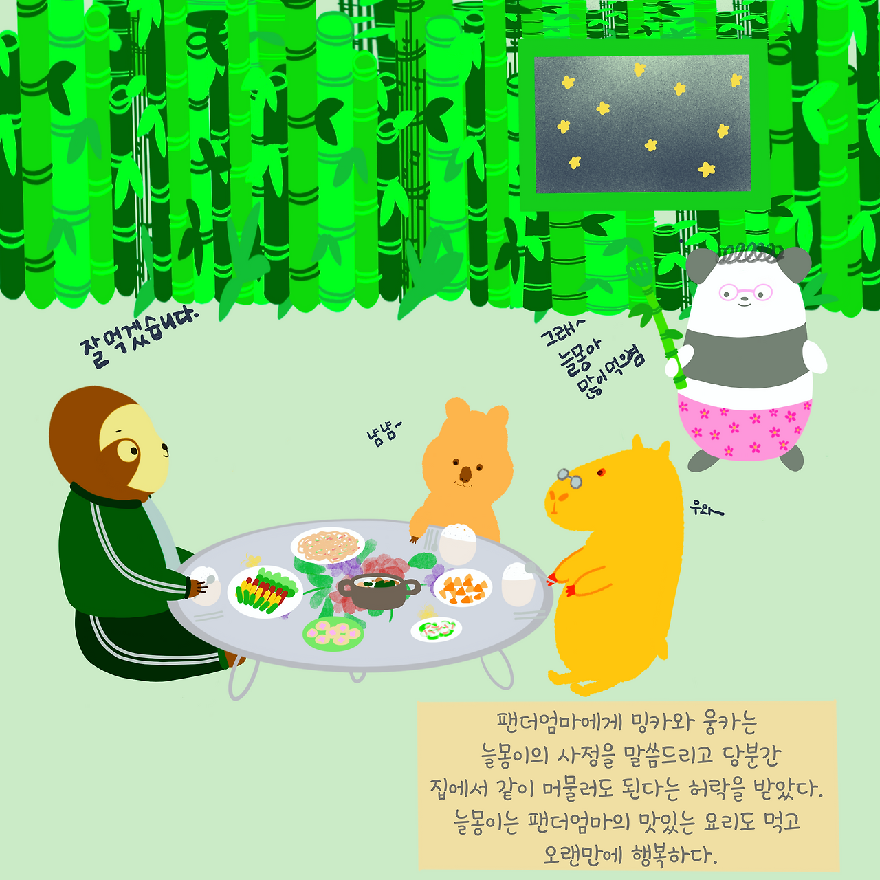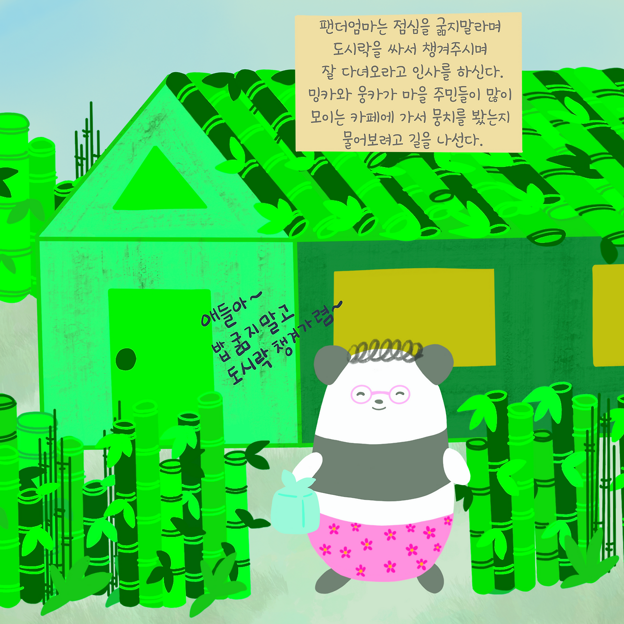 대나무숲의 팬더엄마 집으로 들어간 밍카와 웅카는 그동안 늘몽이의 사정을 말씀드린다.