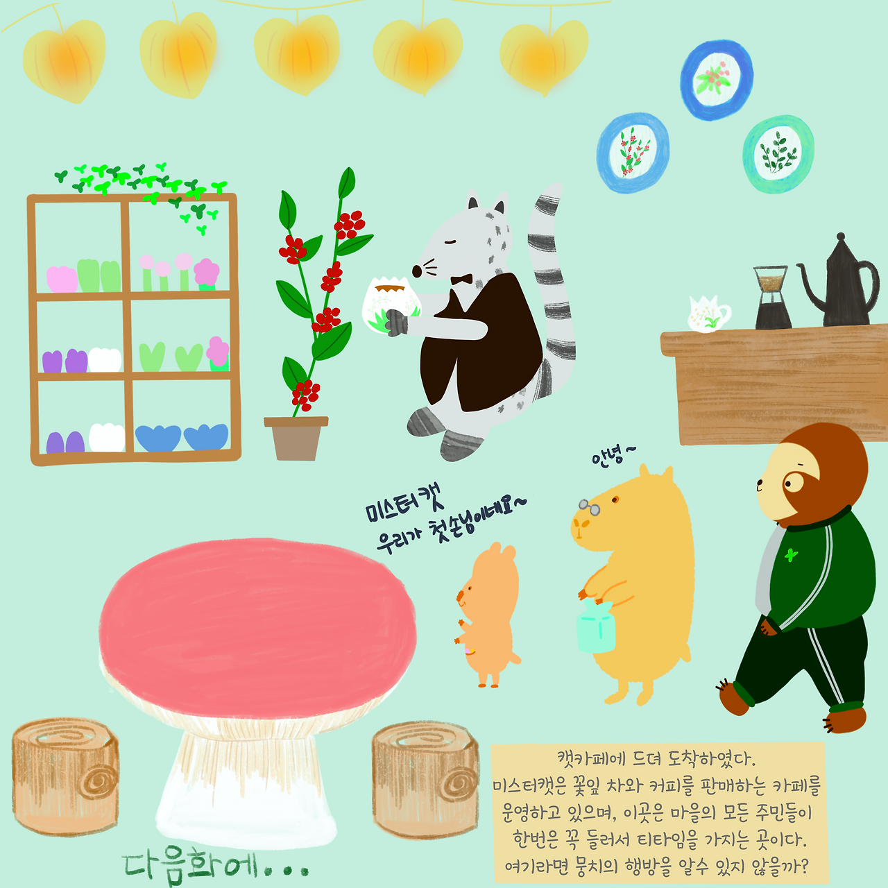 팬더엄마가 싸주신 도시락을 들고 아침일찍 일어나서 마을 주민들이 자주 들린다는 캣카페를 가기 위해서 길을 나선다.