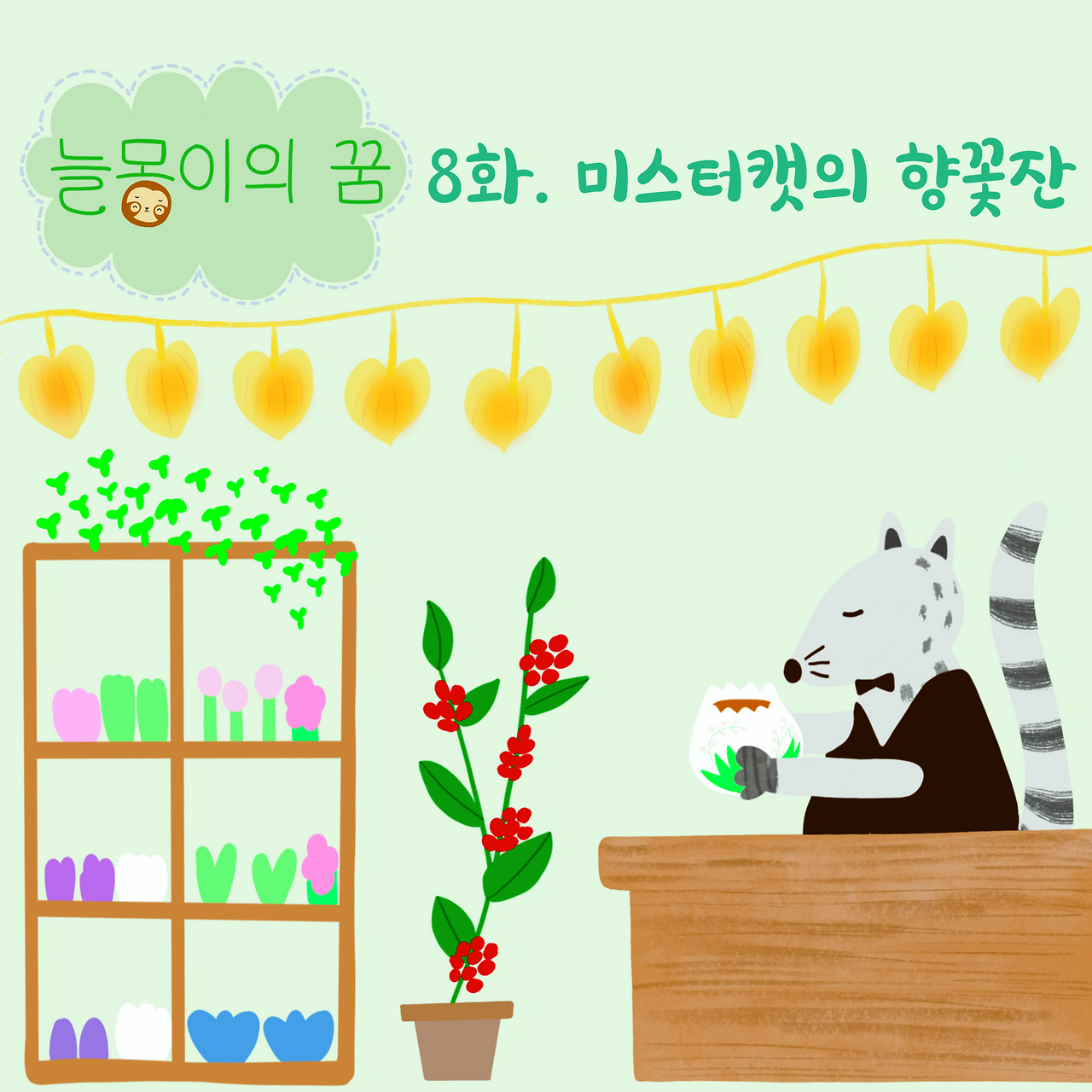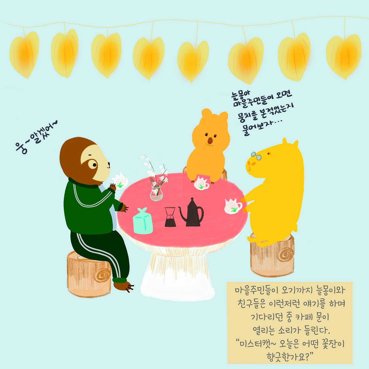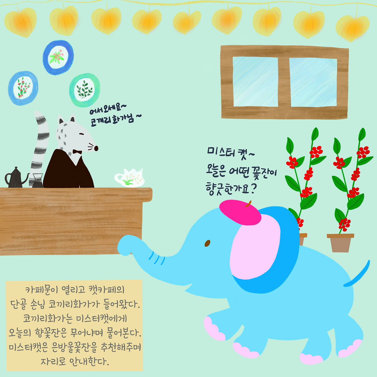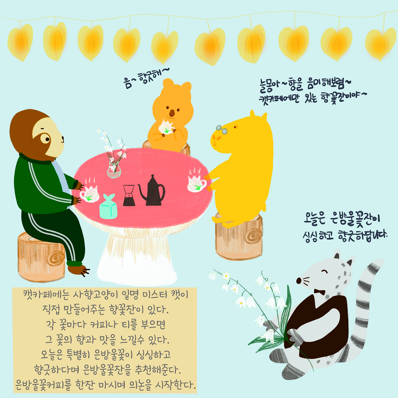 기다리는 동안 친구들은 미스터캣이 추천하는 향긋한 내음의 은방울 향 꽃 커피를 한잔하기로 한다.