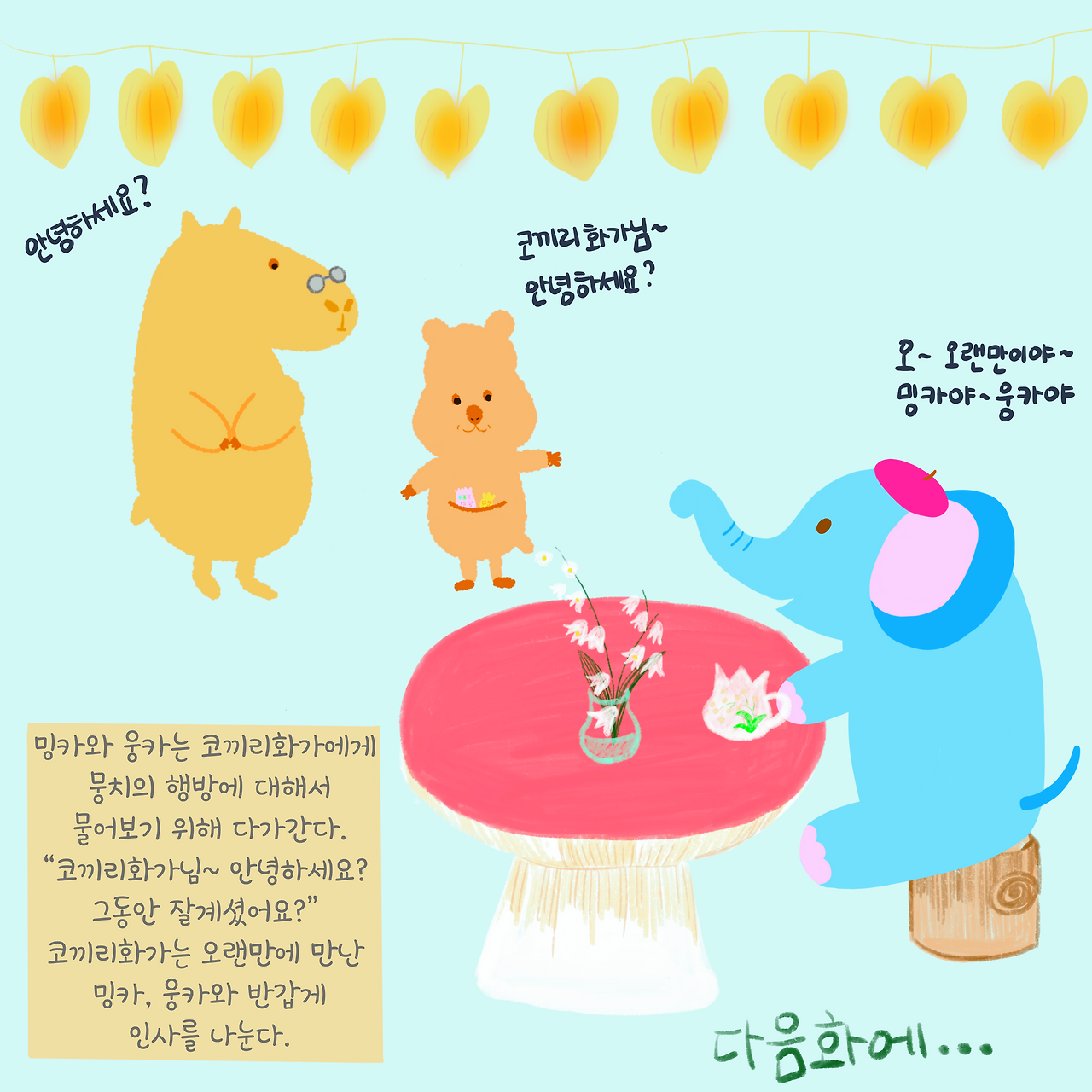 코끼리화가도 오랜만에 보는 밍카, 웅카에게 반가운 인사를 건네는데....