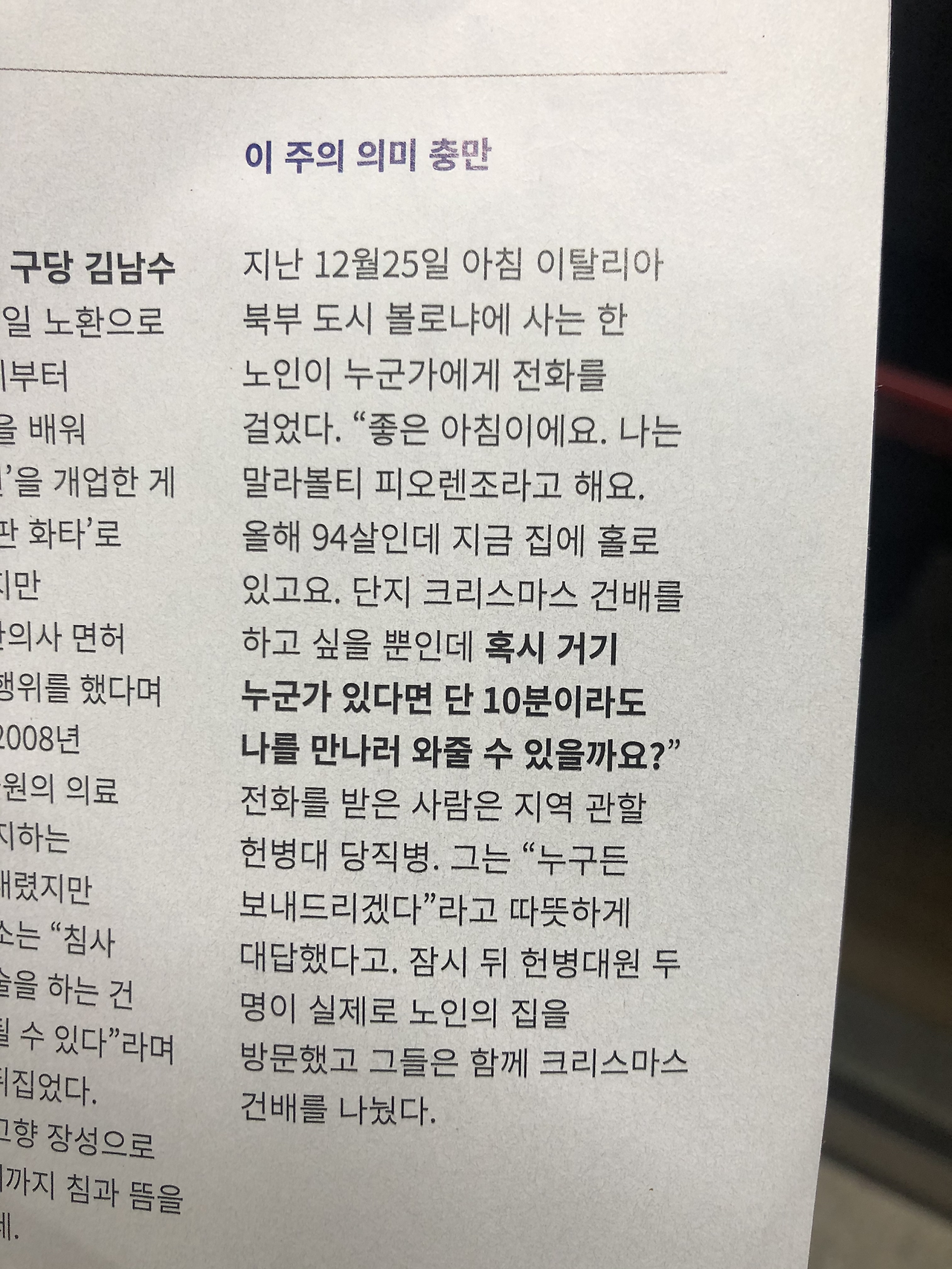 오늘자 행복의 ㅎ은 크리스마스날 건배가 하고 싶었던 94세 피오렌조 할아버지의 이야기다. 할아버지에게 기꺼이 가 준 헌병대 당직병들도 너무 고맙다.