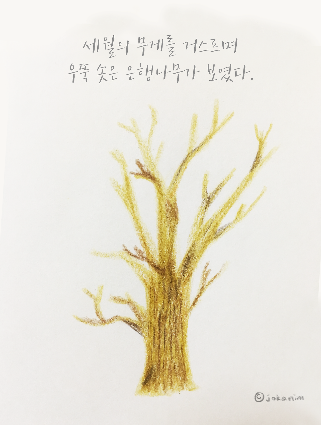 세월의 무게를 거스르며 우뚝 솟은 은행나무가 보였다. 초봄이라 앙상한 나무는 짙은 어둠을 머금고 있었다. 아빠는 외롭게 우뚝 솟은 은행나무를 지그시 보았다. 핸드폰을 들고 그저 조용히 사진 몇 장을 찍었다. 아빠는 나무를 보며 어떤 기분이 드는지, 가만히 서서 무슨 생각을 하고 있는지 궁금했다. 아들은 일일이 묻지 않고, 말없이 나무 앞에 아빠를 세웠다. 아빠는 용문사 은행나무 옆에 나란히 섰고, 당신 앞에 선 아들은 추적추적 봄비가 내리던 그날의 풍경을 마음에 담았다.