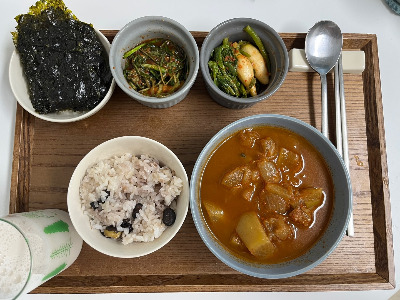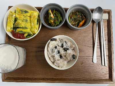 냉동밥을 전자레인지에 돌리고, 누나가 준 매생이블록을 넣어 계란말이를 만들고, 열무김치와 민들레김치를 꺼내고, 아몬드우유를 유리잔에 따랐다.