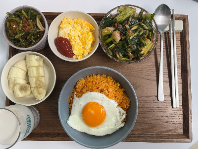 냉동베이컨깍두기볶음밥을 전자레인지에 돌리고, 그 위에 계란후라이 하나를 올리고, 스크램블에그를 하나 만들고, 열무김치와 오이소박이를 꺼내고, 바나나 하나를 먹기 좋게 썰고, 아몬드우유를 컵에 담았다.