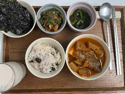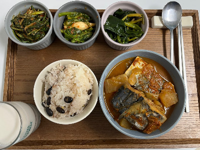 지난밤 안친 검은콩밥을 푸고, 무 넣고 푹 끓인 삼치조림을 그릇에 담고, 본가에서 가져온 민들레김치와 명이나물과 열무김치를 꺼내고, 아몬드우유를 컵에 담았다.