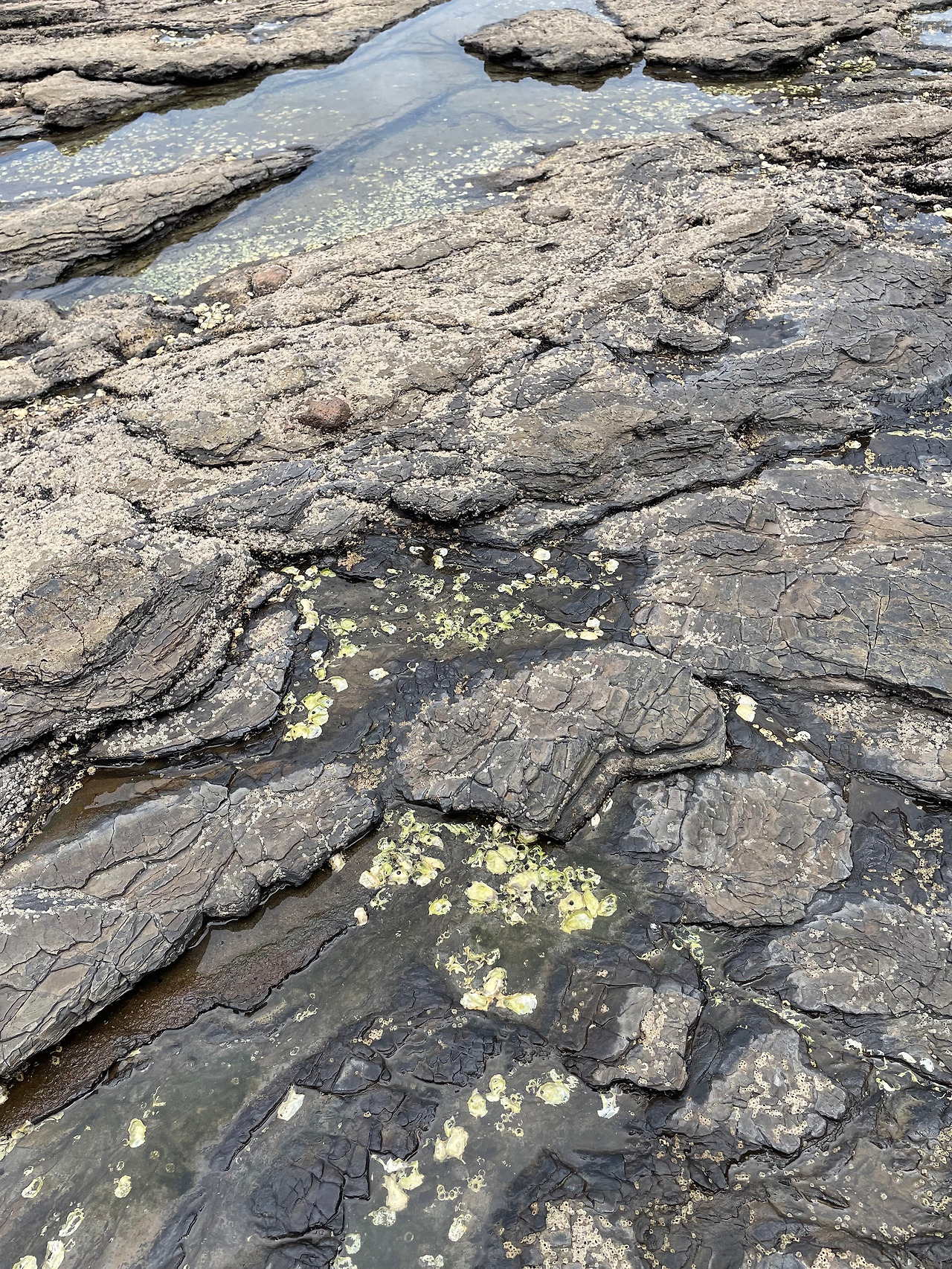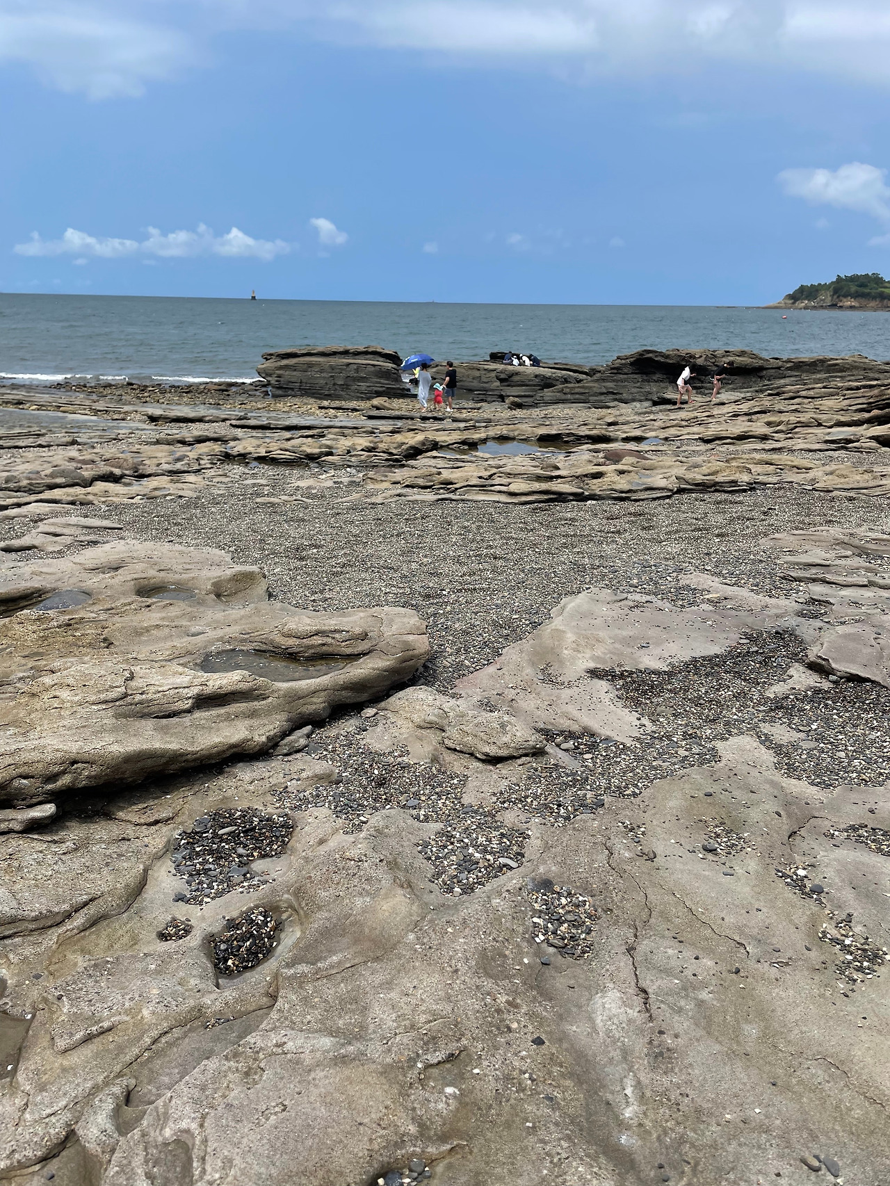 다음 날, 부안의 명소 채석강으로 향했다. 내가 원한 뷰는 해식동굴에서의 실루엣 뷰였는데, 아이들이 협조를 해주지 않았다. 층층이 쌓인 돌들 사이에 있던 고둥과, 새우와, 물고기를 잡느라 여념이 없던 꼬맹이들 덕에, 해식 동굴은 근처도 못 가보고 돌아와야 했다. 그리고 그 고둥과 물고기는 며칠 후 부여의 리조트 어딘가에 방생되었다 한다. (꼬물거리며 커피잔을 기어오르는 것을 구경하는 재미는 있었다.) 채석강은 전북 기념물 제28호이다. 지형은 중생대 백악기의 지층이며, 바닷물에 침식되어 퇴적한 절벽이 겹겹이 쌓여 마치 책을 쌓아놓은 듯한 형세이다. 우리나라 제주도 아닌 곳에서 검은 돌 뷰를 보게 될 줄이야. 제주의 사계 해변이나 광치기 해변이 생각나는 장면들이었다.