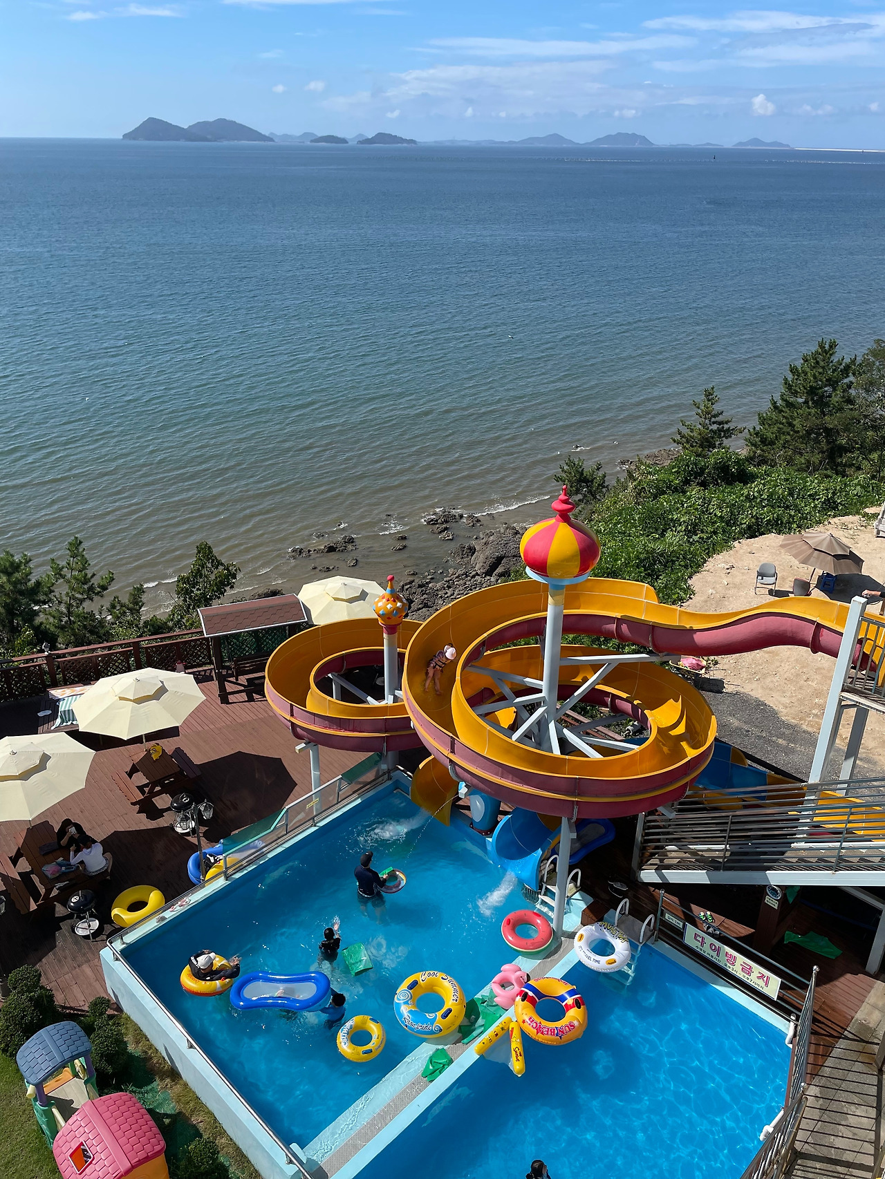 고창에서 부안까지는 그리 멀지 않은 거리이다. 동해안은 많이 봤지만 서해안은 익숙하지 않은 우리들은 이번 기회에 서해 바다를 만끽하고 싶었다. 그리하여 가게 된 곳이 부안 변산반도. 서해 바다가 훤히 보이는 곳으로 다음 숙소를 잡았다. 아이들의 즐거움을 위해 미끄럼틀이 현란한 곳으로 결정. 그리고 그런 나의 선택은 옳았다. 네 시간 동안 최선을 다해 미끄럼틀 타고 즐겁게 놀던 아이들이었다.