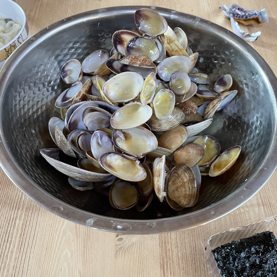 우리 팀이 모은 큰 양동이 한가득 바지락은, 역대급이라 하였다. 어제 왔던 사람들은 대충 좀 캐다가 별 재미를 못 봤다고 한다. 지금까지 체험 한 팀 중 최고로 많이 캐냈다며 놀라워했다. 큰 조개도 제법 들어 있어 아이들도 즐거워했다. 죽은 조개를 간단히 솎아 내는 작업을 한 다음 다시 숙소로 향하는 길, 인간 굴착기 운운하며 모두들 깔깔댔다. 동영상을 찍어놨어야 했다며.