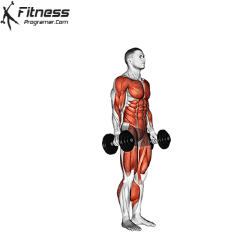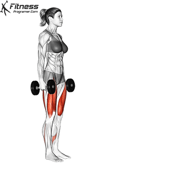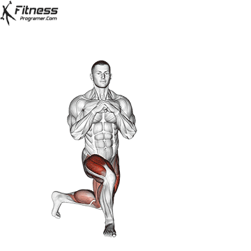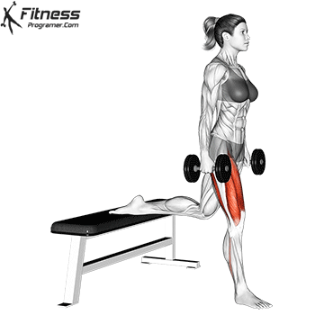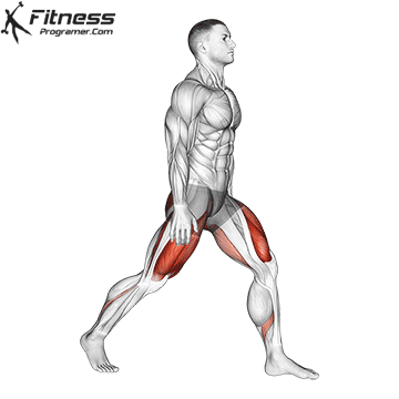 발을 어깨너비로 벌린 채 서서 덤벨을 양손에 팔을 편 채 몸의 양옆으로 든다. 한 발을 앞으로 내딛고 무릎을 구부려 앞쪽 넓적다리가 바닥과 평행하게 한 다음 시작 자세로 되돌아가 반대쪽 다리로 반복한다. 역시, 주동근육은 대퇴사두근(Quadriceps)과 대둔근(Gluteus maximus)이며, 이차 근육은 햄스트링(Hamstrings)과 내전근(adductor), 박근(gracilis), 대퇴근막장근(tensor fasciae latae)이다.