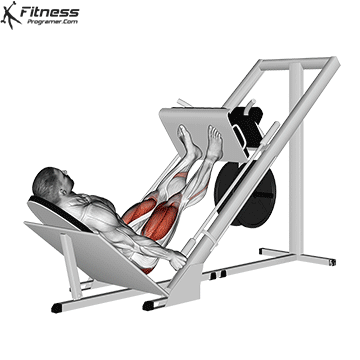 머신에 앉아 양발을 발판에 어깨너비로 벌린다. 손잡이를 이용해 웨이트를 천천히 내려 무릎이 90도로 구부러지도록 한다. 다리를 펴서 다시 시작 자세로 밀어낸다. 대퇴사두근을 강화하는 운동이다. 응용 버전으로 밴드를 허벅지에 걸어두고 하면 둔부의 자극을 더 느낄 수 있다. 발판에서 발을 약간 위에 위치시키면 대퇴사두근보다 둔근과 햄스트링으로 초점이 옮겨간다. 반드시 허리가 뜨지 않도록 등을 완전히 붙이고 복부에 힘을 주고 진행해야 한다. 기구 자체의 무게가 20-30kg 정도 된다고 하니 중량 정할 때 참고하자.