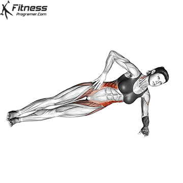 응용 동작으로는 아래 이미지와 같이, 한쪽 팔과 반대쪽 다리를 들어 올리는 자세를 취하는 동작이 있으며, 사이드 플랭크 자세에서 다리를 들어 올리거나 움직임을 주어 내외복사근에 더 큰 자극을 줄 수 있다.