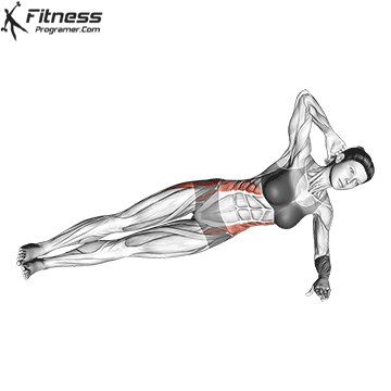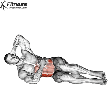 옆으로 누운 상태로 상체를 들어 올려 복사근을 자극하는 오블리크 크런치는 1. 우선 매트에 누워 머리와 허리를 곧게 유지하고 상체는 정면을 주시, 하체는 측면을 향하도록 위치시킨다. 2. 상체를 천천히 위로 들어 올리며 호흡을 내쉬고 최대한 근육을 수축시킨다. 3. 처음 동작으로 천천히 돌아오면서 호흡은 들이마시고 근육을 이완시킨다. 이때 어깨가 바닥에 닿지 않게 하고, 들어 올릴 때는 목을 과도하게 들지 않는다.
