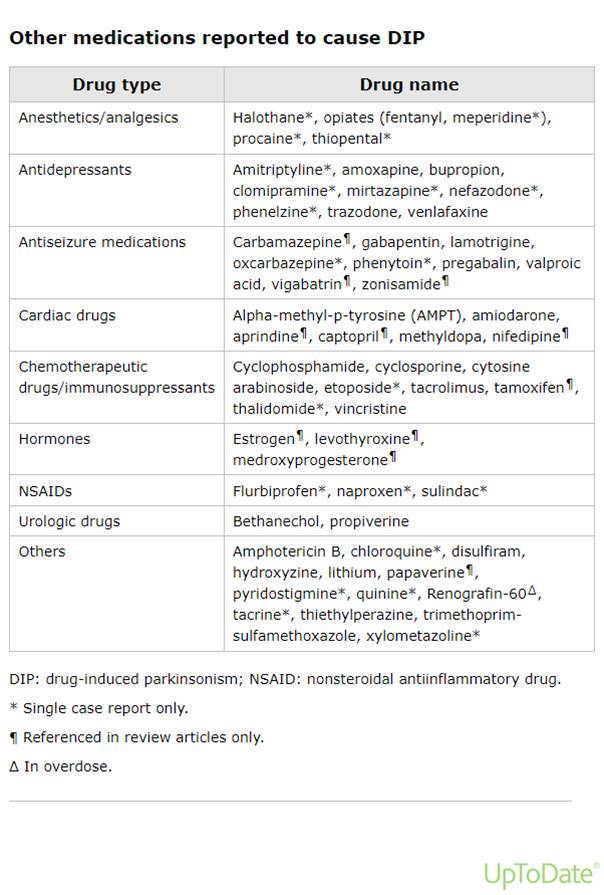 정신건강의학과에서 주로 사용하는 항정신병 약물 역시 자주 볼 수 있는 경우에 해당한다. 도파민 작용에 영향을 주는 항구토제도 조심해야 하며, 신경과에서 쓰는 약 중에서도 항경련제, 칼슘채널 차단제 중에서 편두통에 주로 사용하는 Flunarizine (싸리움, 헤다크, 씨베리움 등), 항우울제 중에서도 TCA 등이 파킨슨 증후를 보일 수 있으니 처방했다면 변화를 잘 살펴야 할 것이다.