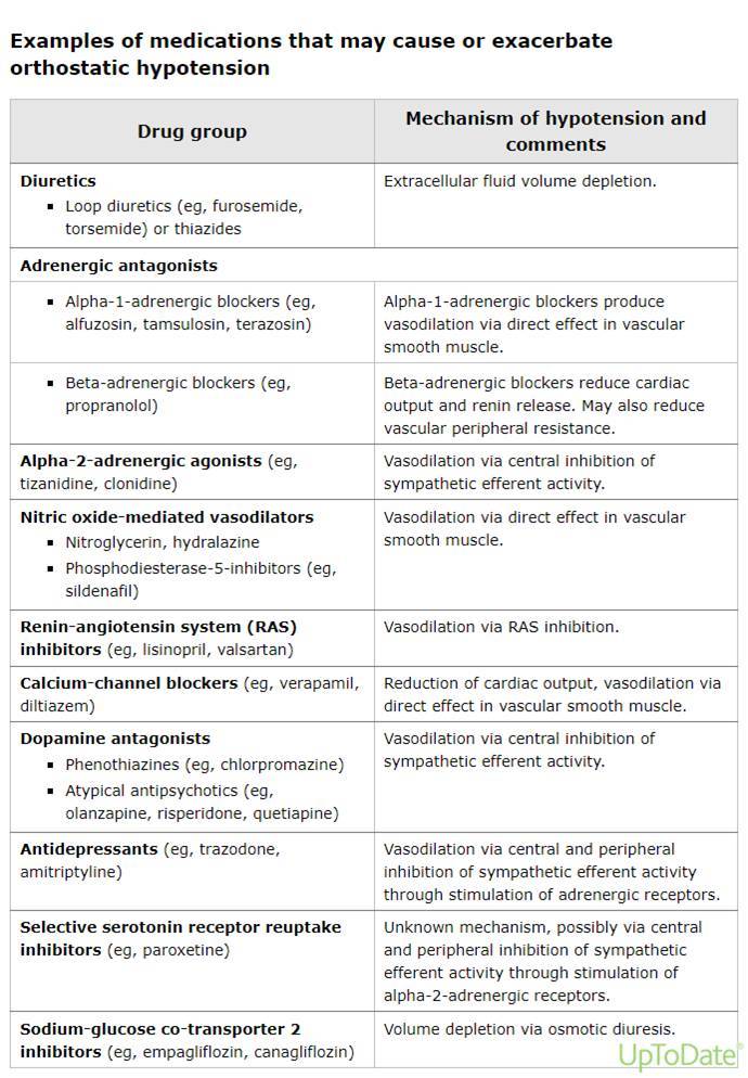 파킨슨 양 증후군을 보일 수 있는 것들 중에 소화제 일부가 원인이 되기도 한다고 에세이를 썼는데, 이는 타과 의사도 잘 모른 채 쓰는 경우가 많지만, 기립성 저혈압은 일반인도 많이 알고 계신다. 전립선 비대증으로 알파 블로커(Tansulosin, 제품명 하루날디, 탐스로신 등)를 쓰는 경우가 많은데, 전립선 비대증의 증상에는 아주 효과적인 약물이다. 그리고 대부분은 장복하는 데 문제가 없다. 하지만 가끔 쓰러져서 내원하는 분들 중에 기립성 저혈압으로 인한 경우가 75세 이상에서는 30% 정도로 있는데 그중에 전립선 비대증이 있어 투약을 시작했거나 복용 중인 분들이 종종 있어 주의를 요한다. 물론 이 약만 기립성 저혈압을 일으키는 것은 아니다. 아래의 표를 일일이 다 알 필요는 전혀 없고 '많다'는 것만 참고하자. 이뇨제도 꼭 써야 하는 사람들이 있는데, 약의 특성상 체액을 빼내는 것이니 기립성 저혈압을 당연히 일으킬 수 있고 그 외에도 많은 약들이 원인이 될 수 있다.