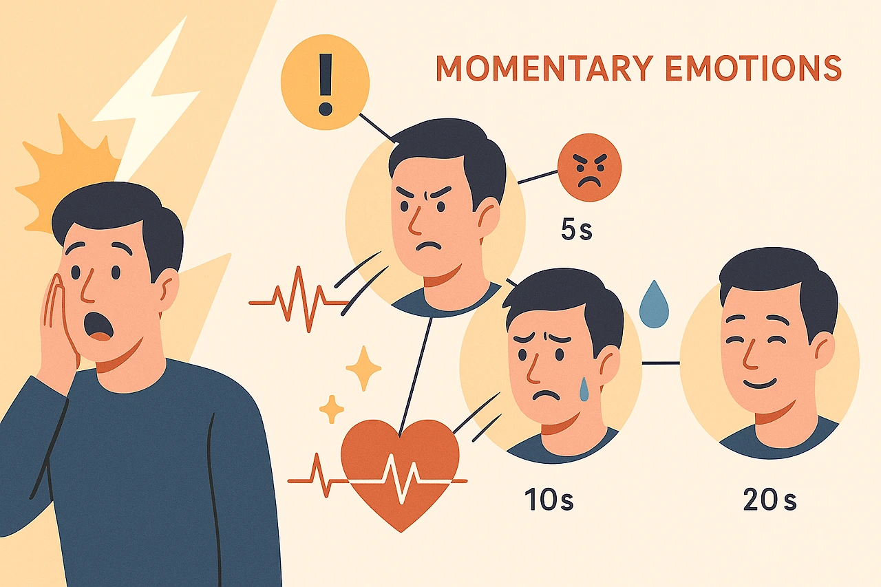 감정은 외부 자극에 대한 본능적이고 순간적인 반응이다. 놀라움, 분노, 슬픔, 기쁨처럼 강렬하고 뚜렷한 감정은 신체 변화와 함께 빠르게 나타난다. 심박수 증가, 얼굴 표정의 변화, 음성 억양의 떨림 등 감정은 보통 생리적 반응을 동반하며, 몇 초에서 몇 분 사이에 사라진다.