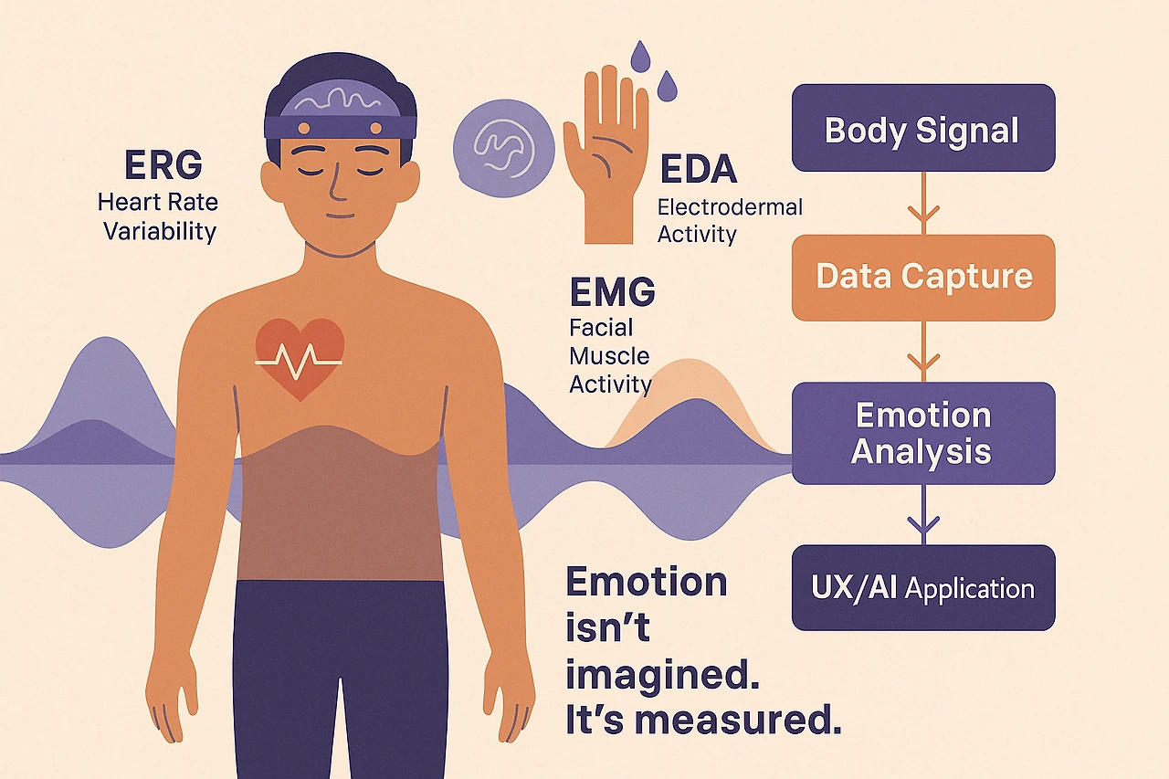 감성공학에서 감성을 객관적으로 측정하기 위해 사용하는 주요 수단은 ‘신체 반응’이다. 심박변이도(HRV), 피부전도 반응, 표정 근육의 움직임, 뇌파(EEG) 등은 감정 상태를 반영하는 생리 지표로 사용된다. 인간의 감성을 이해하고 모델링하는 첫 출발점은 언제나 몸의 반응이다.