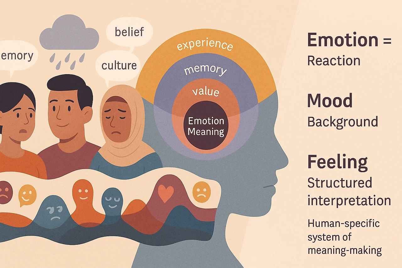 정서는 보다 장기적이고 안정된 감정 상태를 말한다. 기분(mood)이나 감정의 기반 상태로 작용하며, 특정한 자극보다는 개인의 성향이나 환경, 생리적 상태에 영향을 받는다. 정서는 감정의 일시적 파동이 아니라, 그 파동이 움직이는 정서적 ‘기반’이라 할 수 있다.