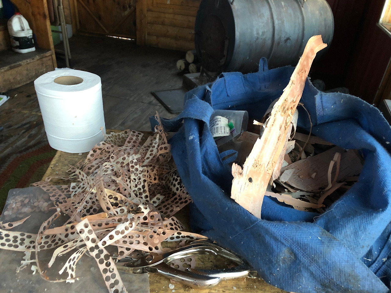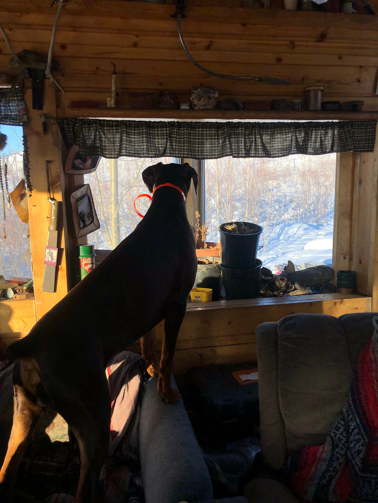 이날은 개썰매를 탔던 곳에서 만난 제레미의 엄마, 도로시가 오기로 한 날이기도 했다. 제레미와 친구는 밖으로 나무를 하러 갔고, 나는 바닥을 쓸고 약간의 집 정리 후 펀치로 나무껍질을 잘라내 작은 도형들을 만들며 시간을 보냈다. 덩치 큰 아기 같은 도베르만 대니는 제레미가 보이지 않자 종일 창문 곁을 떠나지 않았다.