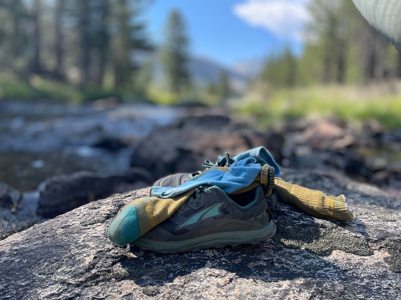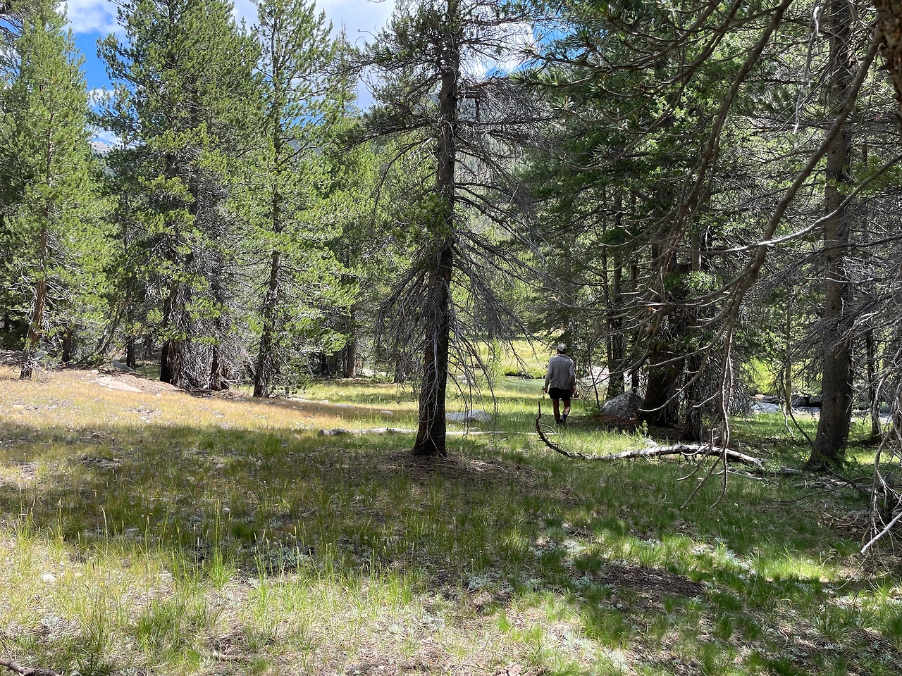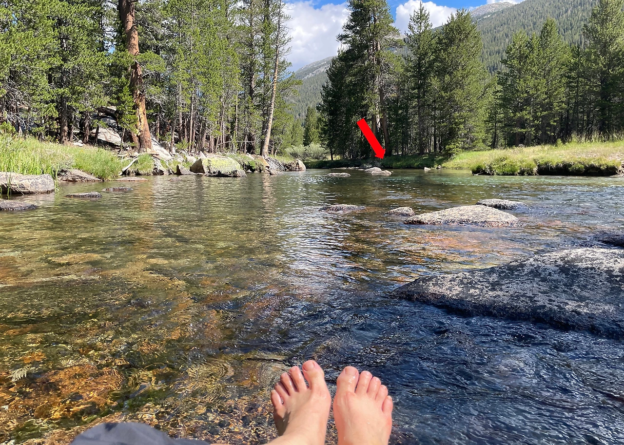 요세미티를 접어드니 많은 낮 등산객들과 백패커들이 심심찮게 눈에 띄었기 때문에 그날은 약간 가벼운 마음으로 걸었던 것 같다. 긴 여정 끝에 우리는 산으로 내려가기 전 잠깐의 휴식을 갖기 위해 냇가로 가서 가방을 풀고 신발과 양말을 벗고 휴식을 취하고 있었다. 나는 냇가의 중턱에 자리 잡은 널따란 돌 위에 있었고 친구는 개울 가장자리에서 휴식을 취하는 중이었다.