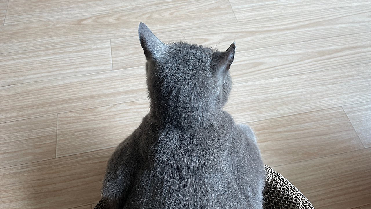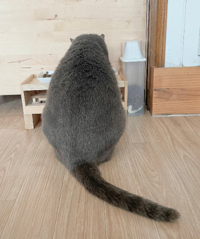 애용이는 온몸이 회색이지만 긴 꼬리에 은은한 패턴을 가지고 있다. 태국고양이 코렛의 특징이다. 아마도 애용이는 다른 회색냥들이 섞인 녀석 같은데 꼬리는 코렛의 특징을 가지고 있다. 너구리 같기도 한 뒷모습에 웃음이 자주 나는 포인트다.