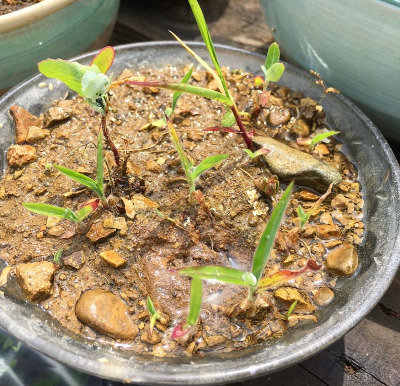 흙속에는 이미 많은 종류의 야생 씨앗이 숨어 있다. 야외의 밭에서 채집된 흙을 준비된 그릇에 담아 물 관리만 잘해주면 일주일 뒤부터 발아를 시작한다. 한 곳에서 채집된 흙에서는 같은 종류가 자라날 가망성이 크므로 되도록이면 이곳저곳에서 흙을 채집하여 섞은 후 관리를 들어간다. 흙에서 직접 발아하기도 하지만 관리하는 동안 바람에 날려 싹을 틔우는 경우도 있다. 이렇게 전시를 준비할 경우는 시간이 꽤 걸리기 때문에 넉넉하게 시간이 확보된 전시 때 준비하는 방법이다.