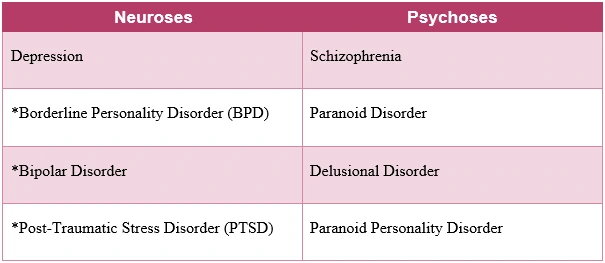 신경증 : 우울증, 외상 후 스트레스 장애 등 -> 자기 질병에 대한 병식이 있고 부분적 일상생활 가능