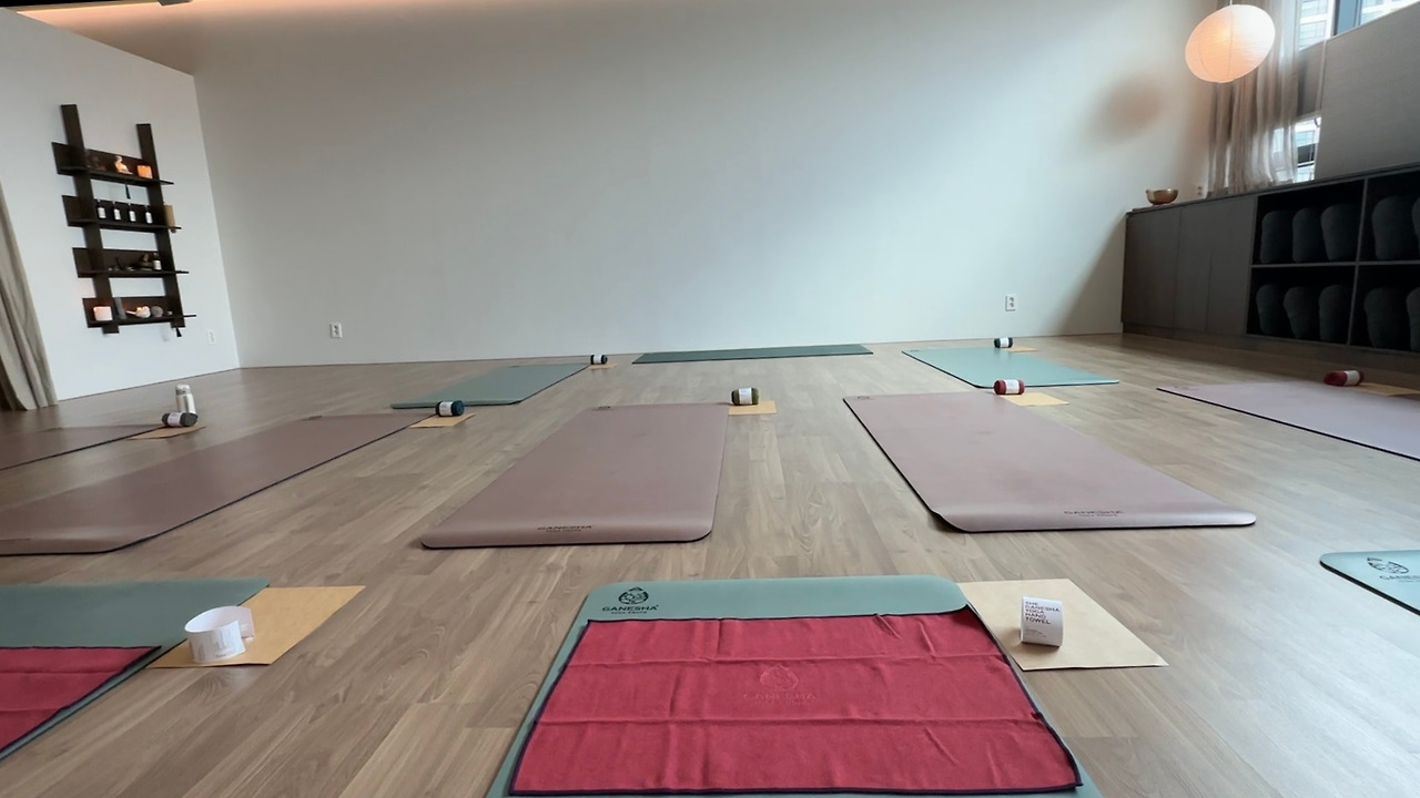 요가원에 도착하니 이미 두 분이 계셨다. 요가원은 과연 새 요가원답게 깨끗. 핸드타월을 착착, 매트도 착착. 다과와 환한 웃음으로 맞아주셨다. 자리를 잡으려는데 해장술이 해독이 됐는지 소화가 시작되는 것 같았다.^^... 혹시 속이 뒤집힐까 싶어서 우리 둘은 맨 뒷열에 자리를 잡았다. 만약 멀쩡했으면 맘에 드는 핸드타월 색 매트를 골랐을 것이다.(핸드타월은 선물이다) 화장실에 다녀와서 몸을 풀었다. 천만다행으로 속이 잘 가라앉았다.