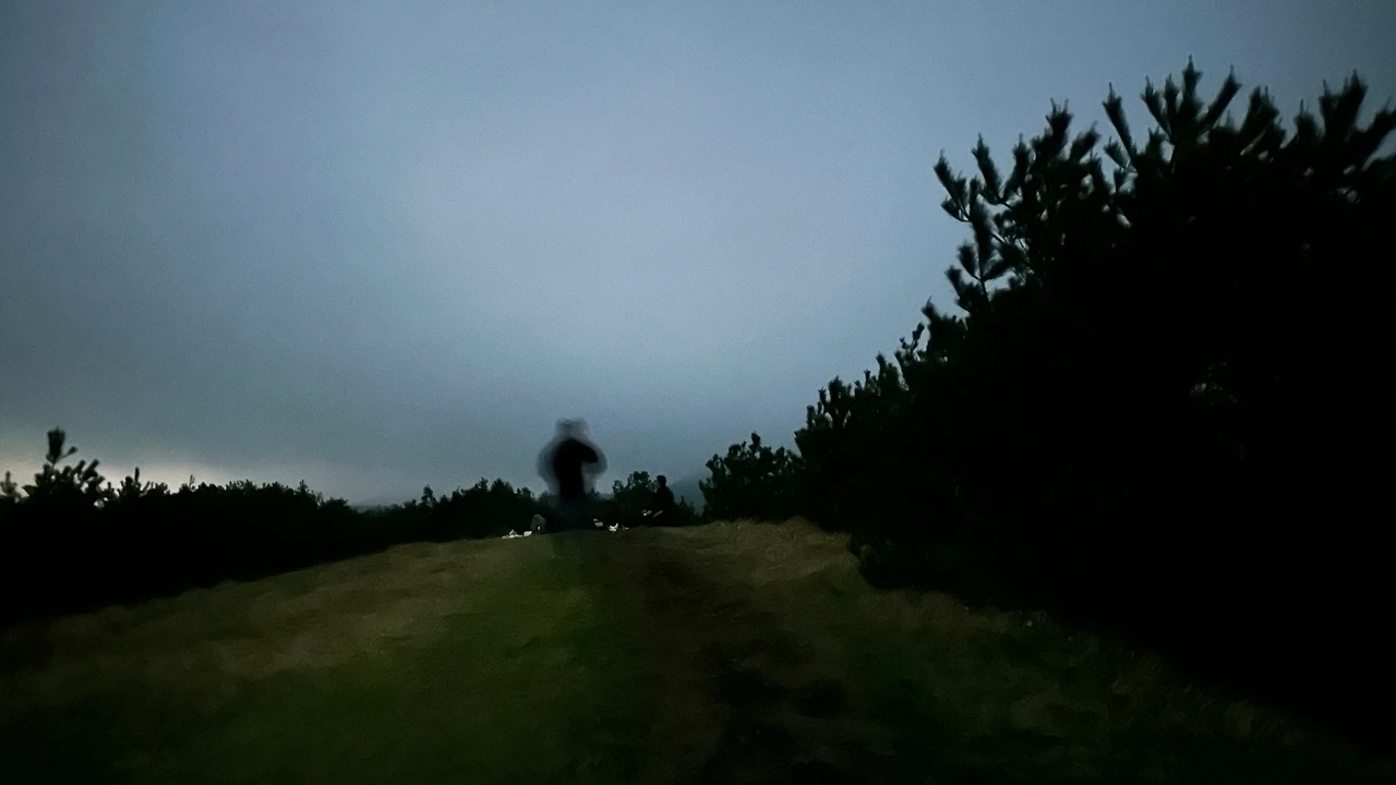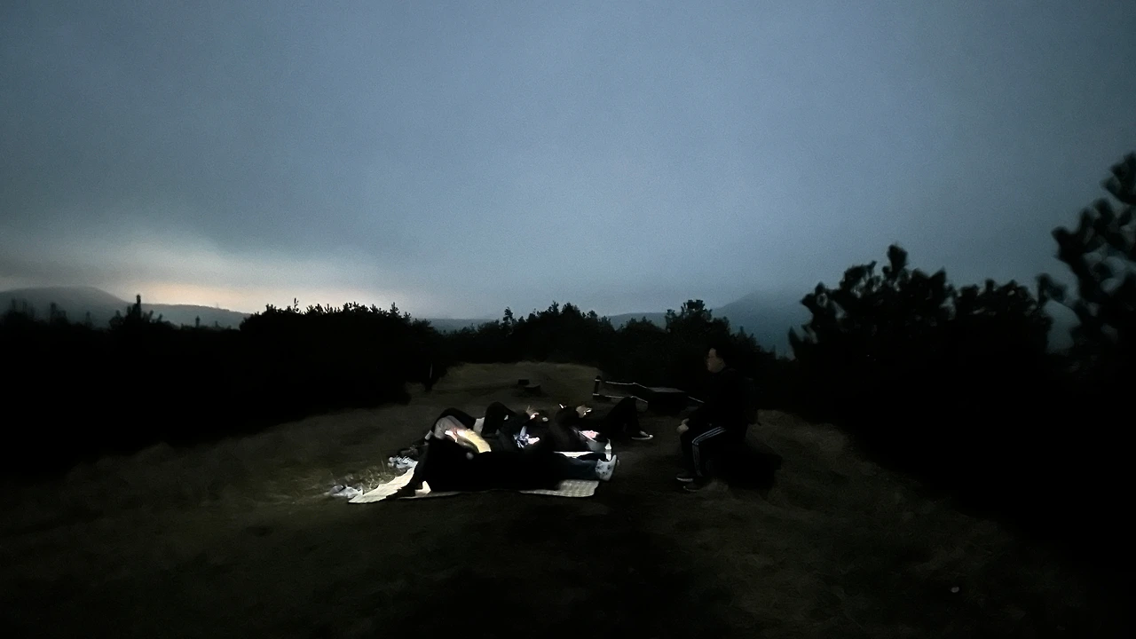 5분 정도 걸어 정상에 도착할 때쯤 갑자기 구름이 몰려왔다. 하늘의 별은 가려지고 곧 달빛까지도 희미해졌다. 구름은 한라산 쪽에서 와서 바다 쪽으로 사라졌다. 별 보러 왔는데 정상에 오니 별이 사라져 버려서 애꿎은 핸드폰 카메라로 사진만 몇 장 찍어볼 뿐이었다. 아쉬웠지만 상황이 어이없고 웃기긴 했다. 정말 하나도 안보였다. 그래도 준비해 간 돗자리를 펴고 여럿이 머리를 한 방향으로 하고 누웠다.