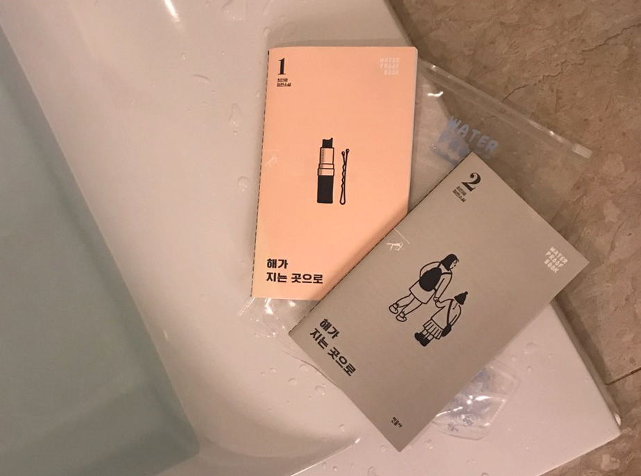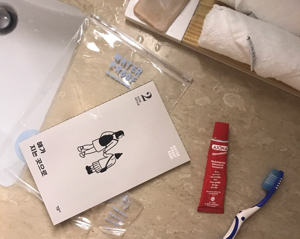 그러나 책이 젖을까봐 팔을 쭉 빼고 읽다보면 어깨가 아파왔다. 그래서 젖지 않는 워터프루프북이 나온다고 했을 때 두 팔 벌려 환영한 것이다. 어떻게 책이 안 젖을 수 있지? 설레는 마음으로 택배를 뜯었다. 정작 책을 투명 파우치에서 꺼낸 건 여행지 호텔에서였다.