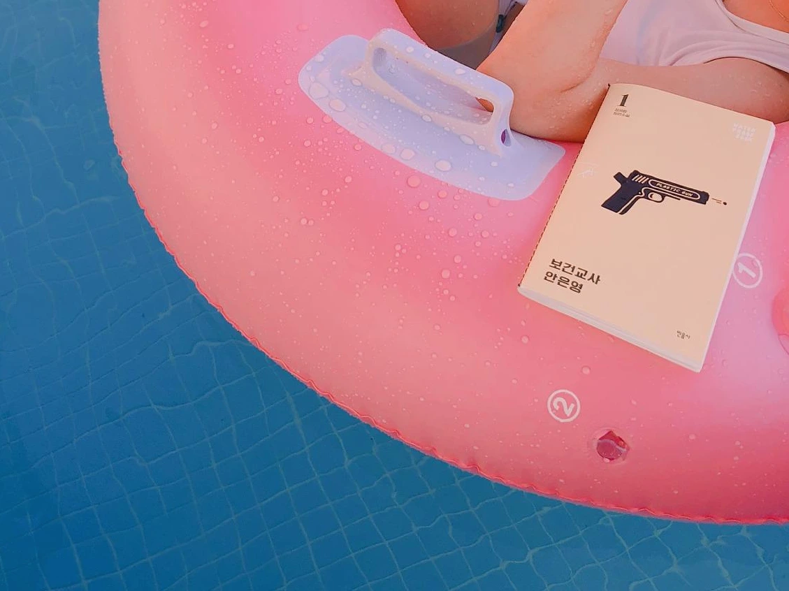 숙소로 돌아왔지만 휴가라고 잔뜩 가져온 에너지를 풀긴 풀어야 했다. 안에만 있기는 일분일초가 아쉬운 상황, 할 수 있는 건 펜션에 있던 수영장에 가는 일이었다. 남동생은 내가 수영을 하러 가자니 졸리다며 귀찮다고 하면서도 나갈 채비를 했다. 그래 이제 너에겐 시간이 없다고 동생아. 지금 졸고 있을 때가 아니야 놀아야 해! 잔소리를 해대며 수영장으로 향했다. 나는 워터프루프 북도 함께 챙겼다.