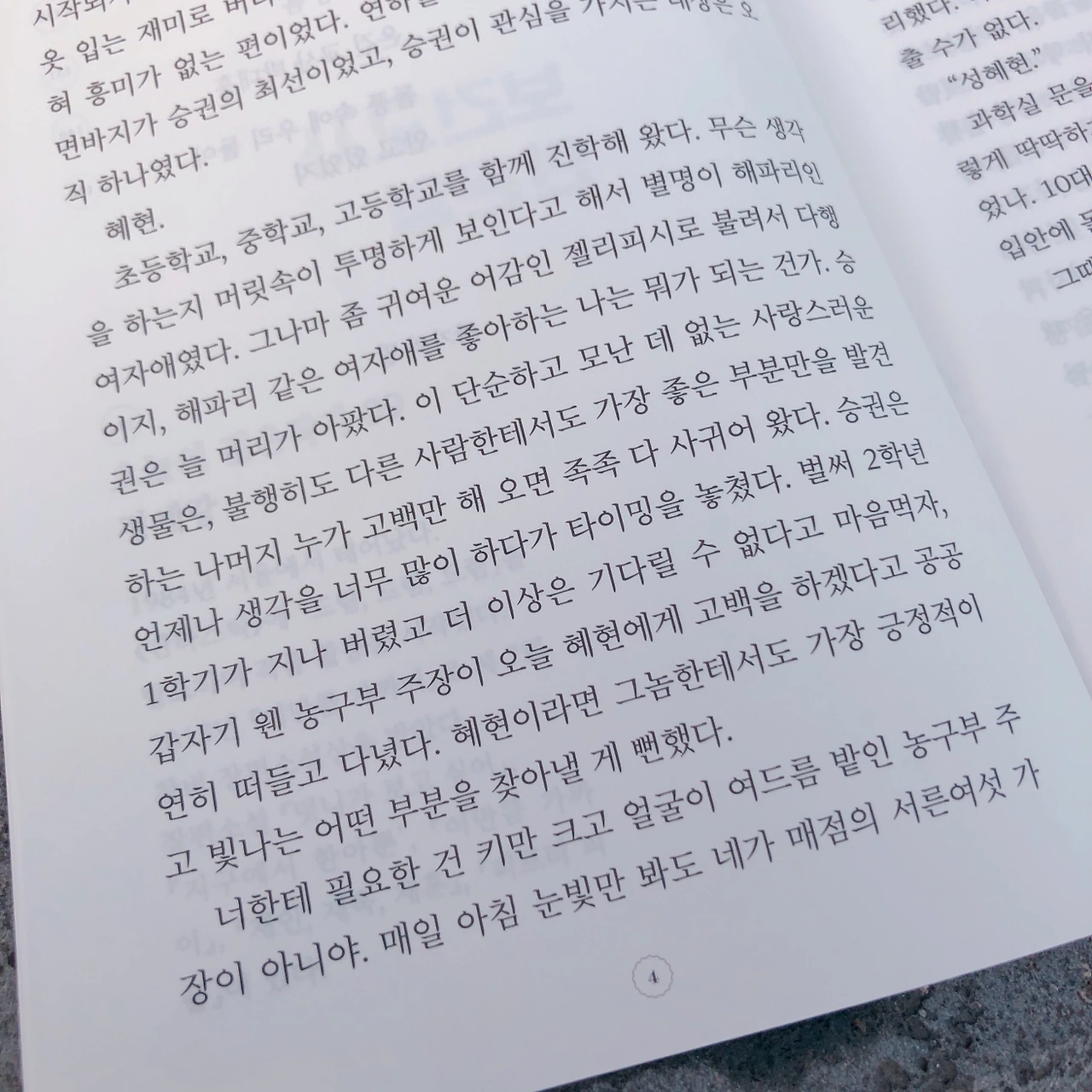 다시 방에 돌아와 책을 말리니 점점 원상태로 돌아오기 시작했다. 이런 책이라면 땀이나 눈물이 묻지 않는다는 점도 장점이 될 테다. 아마 슬픈 이야기를 읽다 눈물이 똑 떨어져도 감쪽같이 돌아올 테니까. 이런저런 생각을 하면서 천천히 종이가 부드럽게 마르는 것을 지켜보는 재미도 쏠쏠했다. 나는 젖지 않는 책처럼 동생도 군대에서 고되고 외로울 시간에 잠시 젖을 테지만, 다시 바짝 뽀송해질 수 있으면 좋겠다고 생각했다.