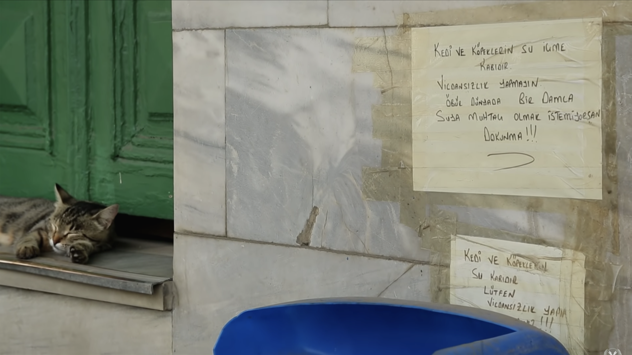 어떤 사람은 길고양이가 모두 입양되어 위험한 환경에서 사는 길고양이가 한 마리도 없었으면 좋겠다고 말한다. 하지만 갈라타 타워 근처에서 옷 가게를 하며 고양이 사리(Sari)에게 앉을 곳을 내어주고 그녀와 교감하는 동네 주민은 쓰다듬자고 고양이들을 집에 가두어 두는 것은 옳지 않다고 말한다. 이스탄불에서는 고양이에게 먹이나 물을 주고, 아프면 병원에 데려가면서도 고양이가 가고 싶어하면 가게 내버려두는 것이 당연하다고 생각한다. 동네에 동물 병원마다 외상이 잔뜩 있는 집이 많단다.