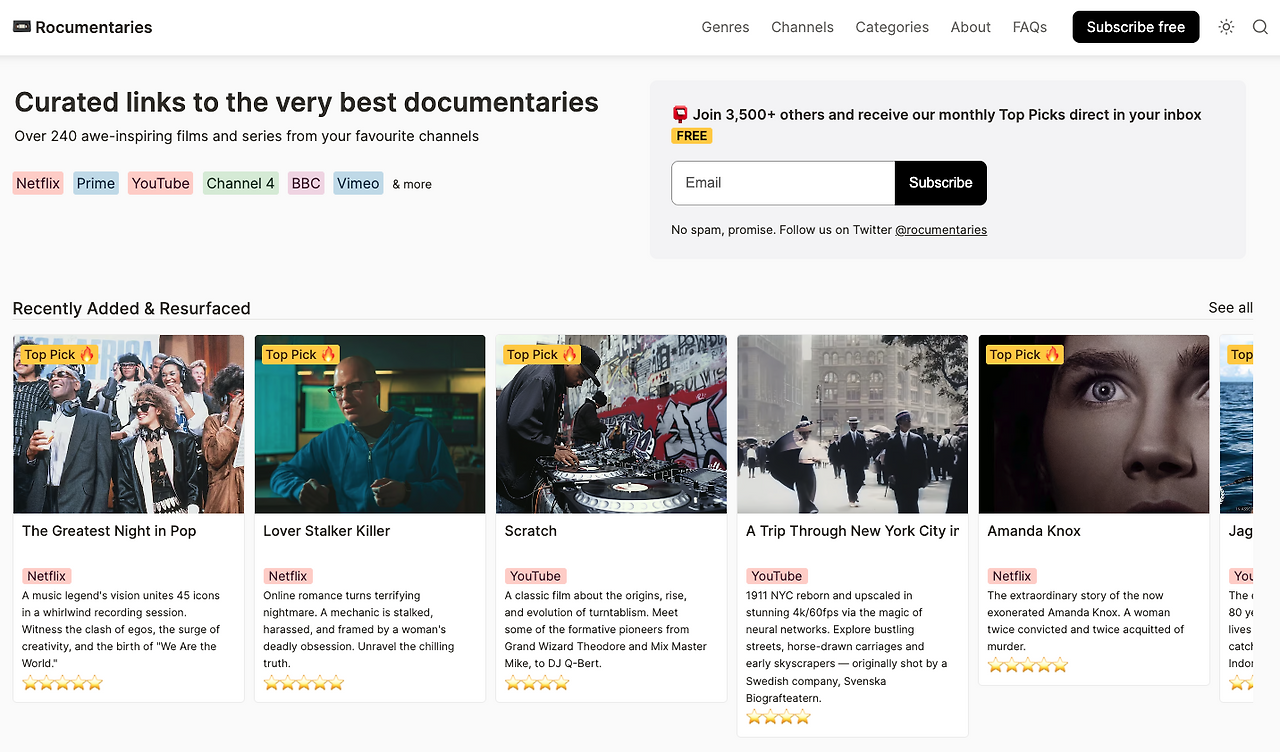 다양한 플랫폼의 다큐멘터리를 한 곳에서 탐색