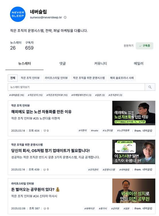 이렇게 생각하는 가장 큰 이유는 지속성이에요. 1년 이상 지속적으로 하기 위해선 내면 동기가 필요해요. 네버슬립 뉴스레터를 시작할 때는 '다른 사람들은 어떻게 창업해서 저렇게 잘 성장하는 거지?'라는 질문에서 시작했어요. 유튜브는 ‘강의 유치를 위해 어떻게 노출하면 좋을까?, 새로운 툴을 매번 배우기 힘든데 어떻게 환경설정을 하면 좋을까?’ 였고요.