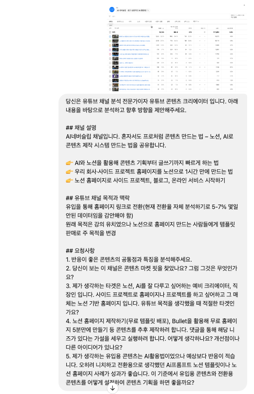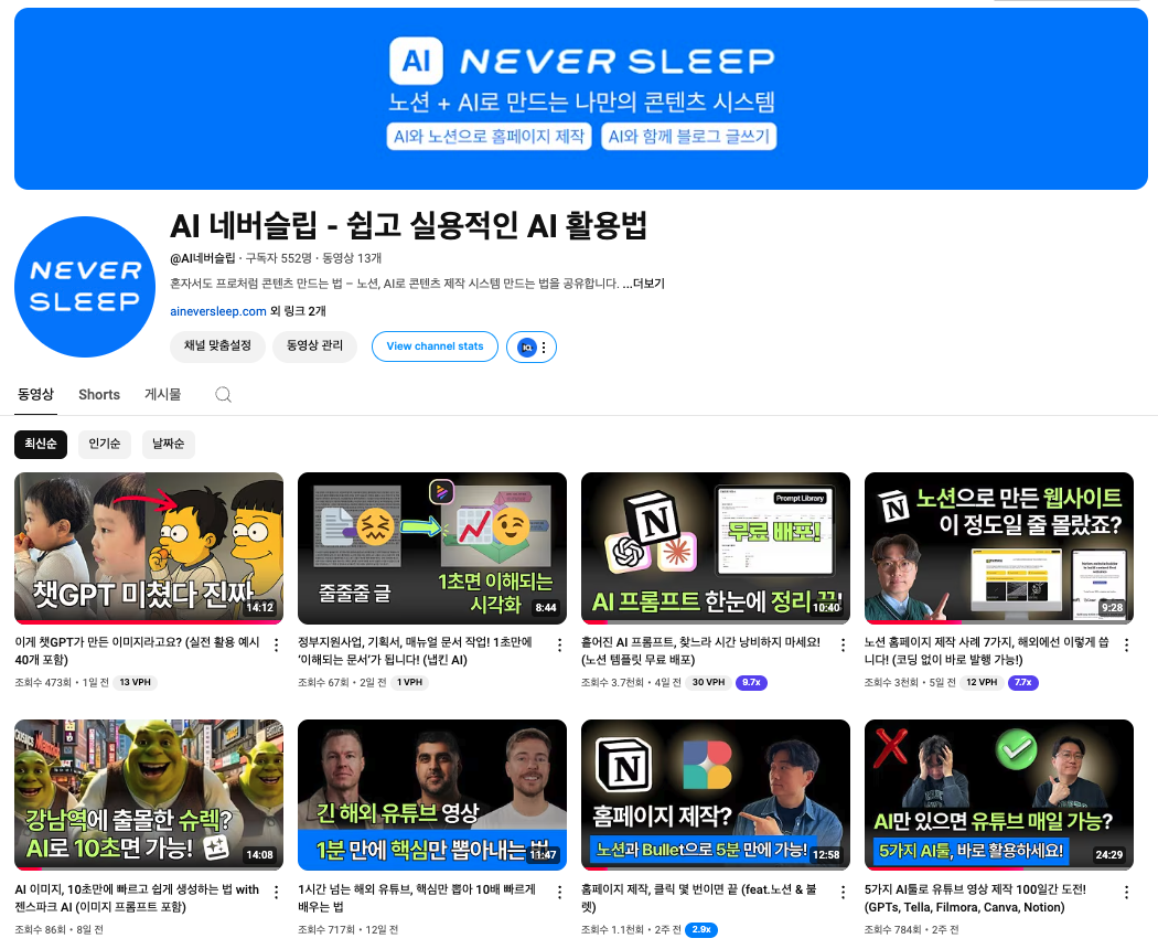 3. 향후 기획은 “노션 × AI”를 기본 축으로, 유입용(노션과 AI를 결합해 더 폭넓은 사람들을 끌어들일 수 있는 ‘가벼운 팁/소개형’ 영상), 전환용(템플릿·홈페이지 제작 실전 예시나 성과 공유, 무료/유료 템플릿 배포 및 구매 유도로 명확히 구분해서 운영해 보시길 바랍니다.)