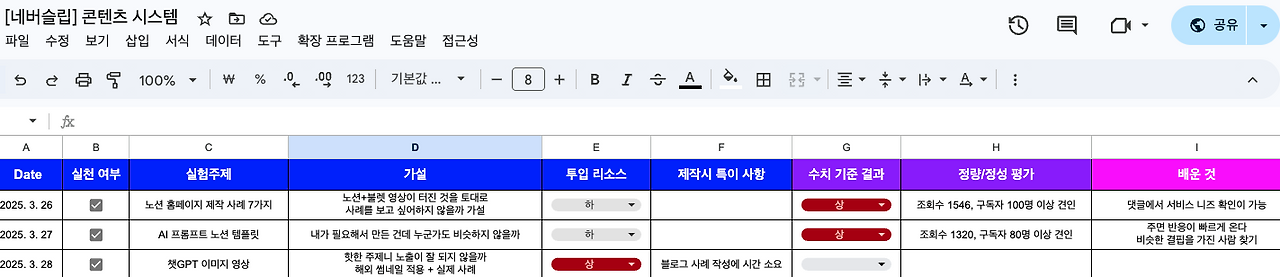 제가 세운 가설 검증을 위해 데이터를 하나씩 기록하기 시작했어요. 거기에 대한 영감은 다른 글에서 소개드린 Anne-Laure의 여정에 있습니다. (해당 글도 꼭 한 번 읽어보세요!) 그때그때 감에 의존하는 것이 아니라 매일 하나의 가설을 세우고 이를 테스트하는 방식으로 시작하고 있어요. 실험을 통한 결과를 가지고 배운 것과 적용방안을 일자별로 하고 있어요. 이것도 100일이 쌓이면 큰 경험 자산이 될 거라 생각해요. 인사이트가 쌓이면 이것도 공유장을 마련해 볼게요!