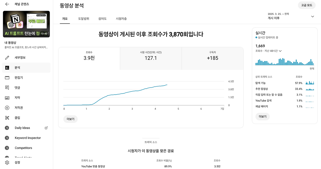 전혀 생각지 못하게 영상 하나에서 조회수 3천이 나오며 새로운 구독자 185명을 견인하고 있어요. 제가 생각하기에 딥하다 생각하던 콘텐츠였는데 반응이 좋았어요. 다른 콘텐츠도 마찬가지고요. 제 생각, 직관이 아니라 실행 후 데이터에 맞춰 세밀한 기획을 해야겠다 싶었어요.